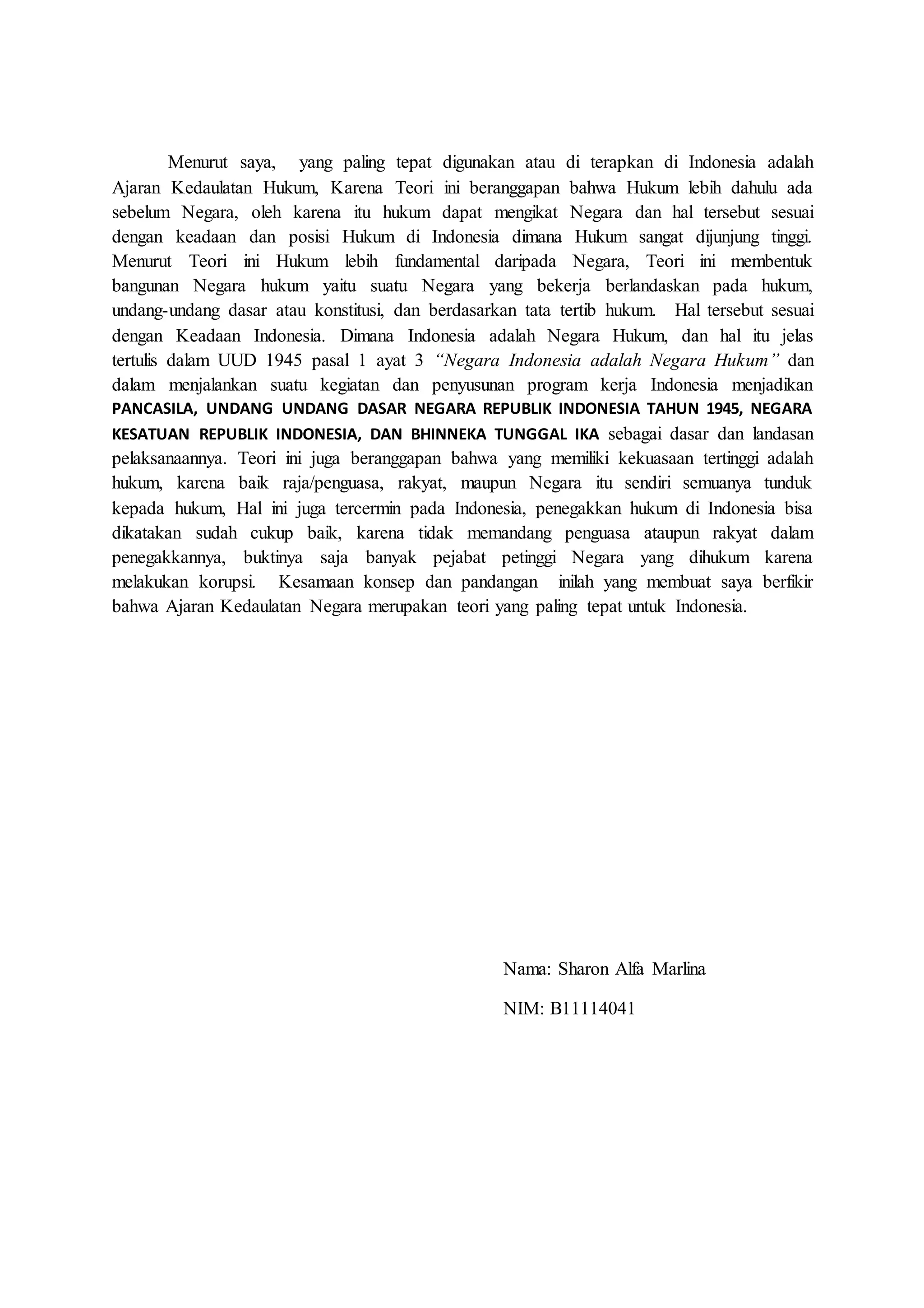 Ajaran kedaulatan hukum dianggap paling tepat diterapkan di Indonesia karena menganggap hukum lebih fundamental daripada negara. Hukum di Indonesia dijunjung tinggi, tercermin dalam UUD 1945 yang menyatakan Indonesia adalah negara hukum, dan penegakan hukum yang adil bagi semua warga negara. Konsep ini menunjukkan bahwa kekuasaan tertinggi berada pada hukum, yang juga digaungkan oleh pelaksanaan Pancasila dan prinsip Bhinneka Tunggal Ika.