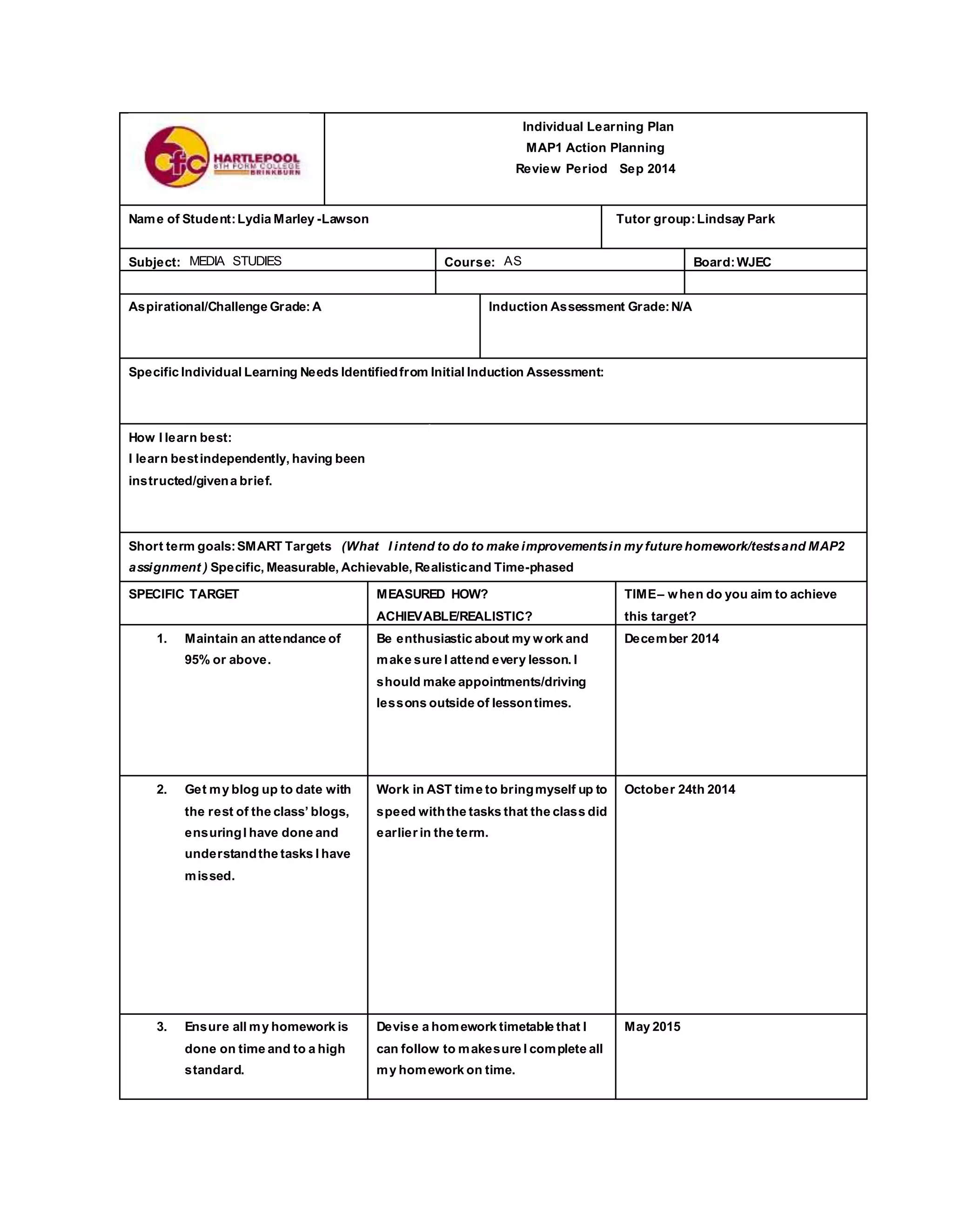 This document outlines Lydia Marley-Lawson's individual learning plan for her AS Level Media Studies course. It identifies her preferred learning style of working independently after being instructed. Her short term goals are to maintain 95% attendance, update her class blog to be current, and ensure all homework is completed on time and to a high standard. Her long term goal is to achieve an A grade by the end of the AS course by working hard in lessons, completing extra work, and maintaining excellent attendance and punctuality.