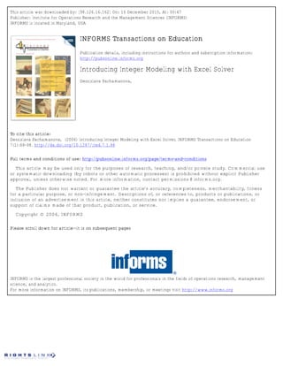 This article discusses introducing integer modeling concepts to MBA students using a case study about a small organic farm. The case involves determining the optimal distribution channels and allocation of produce among channels to maximize profits. Students first analyze costs and revenues for different channels through an accounting exercise. They then create a linear optimization model to allocate produce, using binary variables to represent channel selection. However, Excel Solver cannot directly handle integer constraints. The article proposes introducing integer programming by having students solve the linear model for different channel combinations, then automating the process using binary integer variables. This allows teaching classical integer modeling concepts in a business context accessible to students. Key discussion points include optimization software limitations and validating model assumptions.