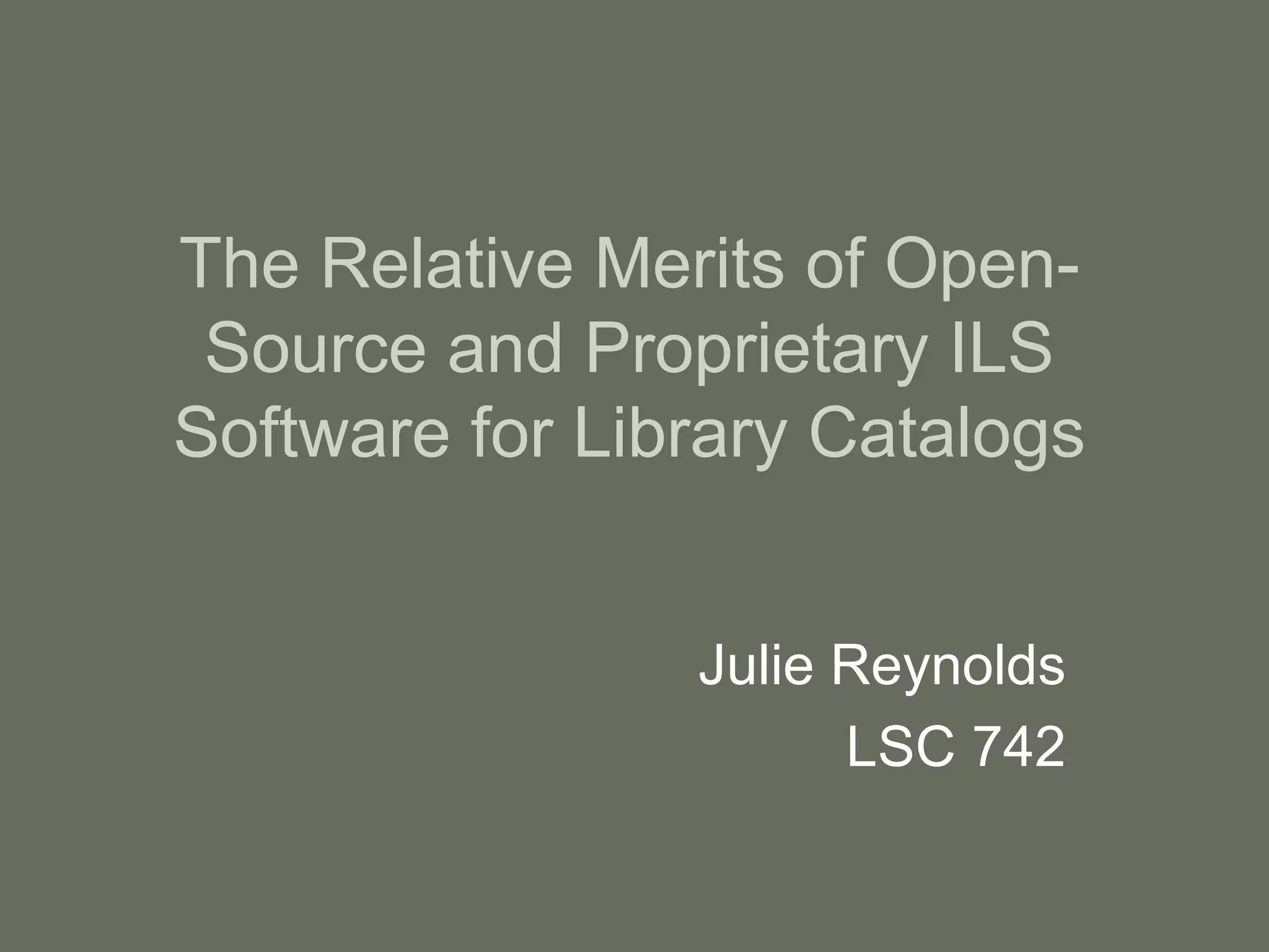 The document discusses open-source and proprietary library catalog software. It defines open-source software and lists criteria it must meet including being freely redistributable and allowing modifications. Examples of open-source catalog software are provided like Koha and Evergreen. Factors to consider when choosing open-source software are also outlined. Proprietary software is created by vendors and available through paid licenses, which cover support and maintenance. Popular proprietary catalog systems like Voyager, Millennium, and SirsiDynix are mentioned. The document concludes that cost is important but not the only factor to consider, and that training, technical support needs, and ability to stay current also impact the choice between open and proprietary systems.