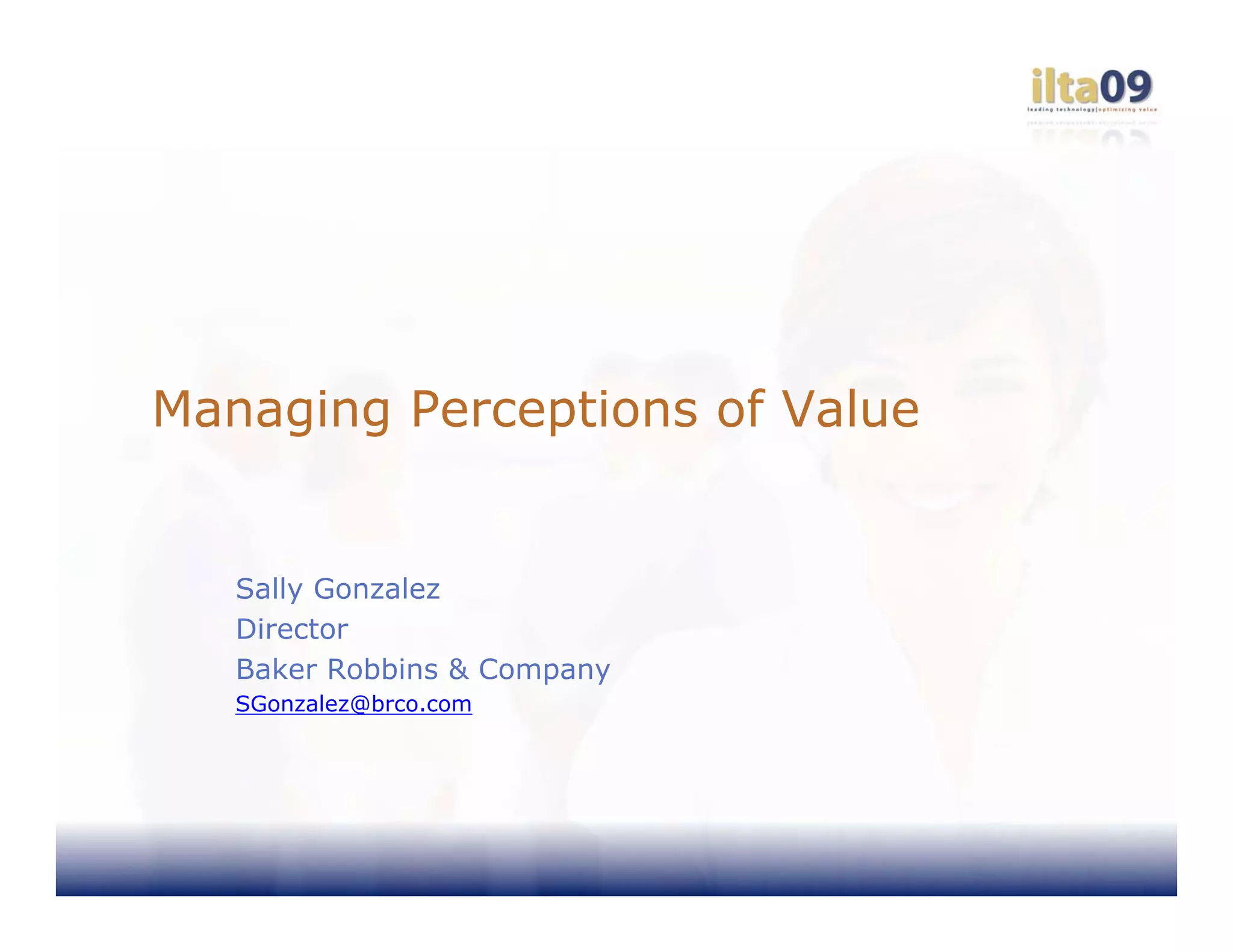 This document discusses how to build perceptions of value for technology solutions among clients and lawyers at law firms. It notes that value is subjective and situational. The document outlines various technology solutions firms provide, from basic services like email to more customized offerings. It discusses the need to understand what clients value and how solutions can help meet client goals. The document also stresses the importance of communicating value internally to gain support. Overall, the key points are: 1) Value is subjective and must be defined for each client and situation; 2) Firms should craft solutions that meet clearly defined client needs and goals; and 3) Communicating value internally and externally is crucial to gaining support and fulfillment expectations.