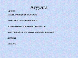 АгуулгаОршил БОДИТ ЕРТӨНЦИЙГОЙЛГОХУЙ ХҮҮХДИЙН ХӨГЖЛИЙН ПРОЦЕСС БОЛОВСРОЛЫН ТОГТОЛЦОО ДАХЬ БАГШ ХҮМҮҮЖЛИЙН ЭЕРЭГ АРГЫГ ХЭРЭГЛЭХ ЗӨВЛӨМЖ ДҮГНЭЛТ НОМ ЗҮЙ - 3.
