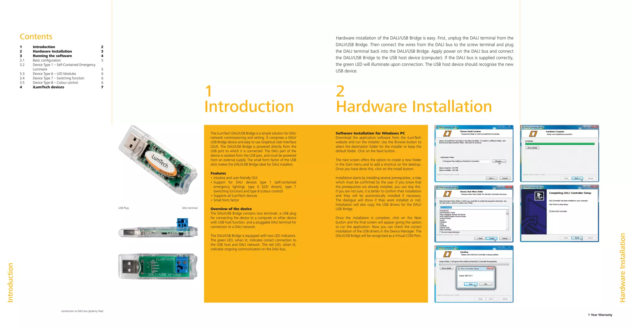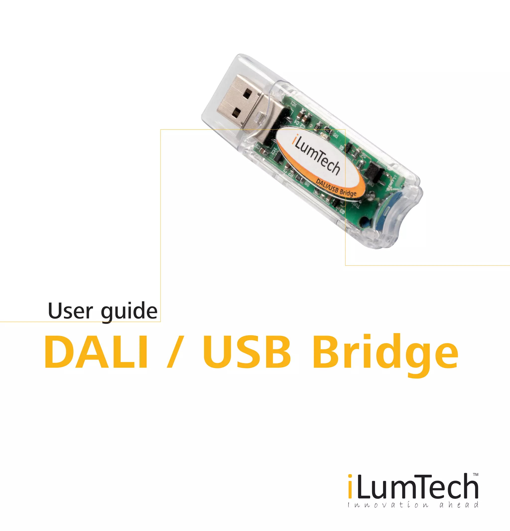 The document is a user guide for the Ilumtech DALI/USB bridge, a device used for DALI network commissioning that connects via USB and supports various DALI device types. It details hardware installation, software setup, and how to operate the bridge using an intuitive graphical user interface to manage connected DALI devices. Additionally, it outlines features specific to different device types such as emergency luminaires, LED modules, and ambient sensors.