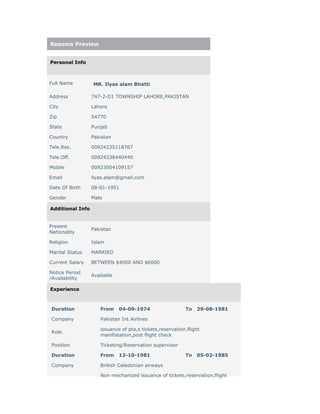 This resume is for Mr. Ilyas alam Bhatti, a 68-year-old male from Lahore, Pakistan. He has over 40 years of experience in airline ticketing and reservations, including roles as a Ticketing/Reservation Supervisor at Pakistan International Airlines from 1974 to 1981 and working for British Caledonian Airways from 1981 to 1985. He is seeking full-time employment and has strong skills in teamwork, leadership, communication, and customer service according to his self-ratings.