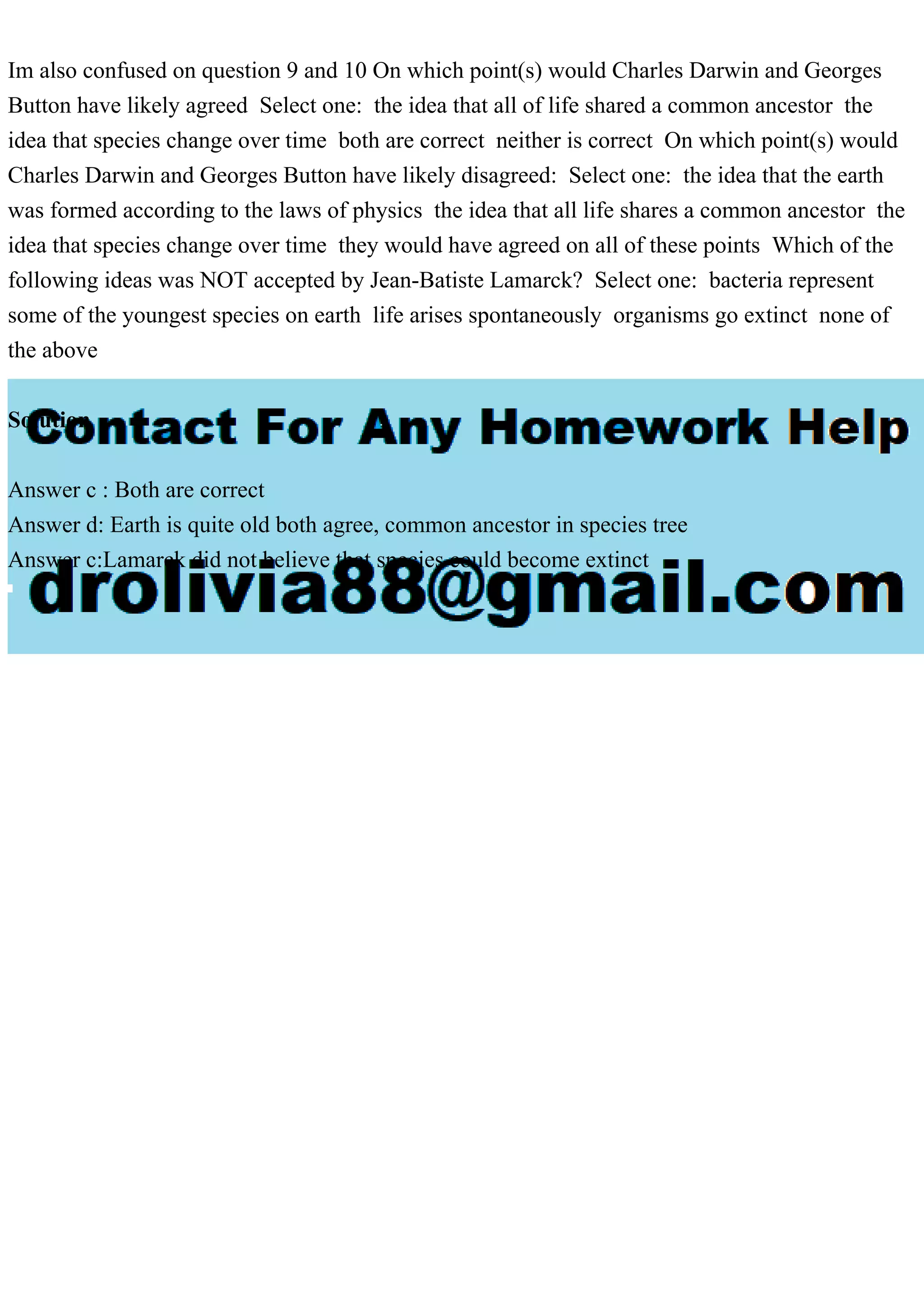 The document discusses questions regarding the agreements and disagreements between Charles Darwin and Georges Buffon on evolution and the nature of species. It also touches upon Jean-Baptiste Lamarck's views, indicating that he did not believe species could become extinct. The correct answers to the questions posed reflect these historical scientific perspectives.