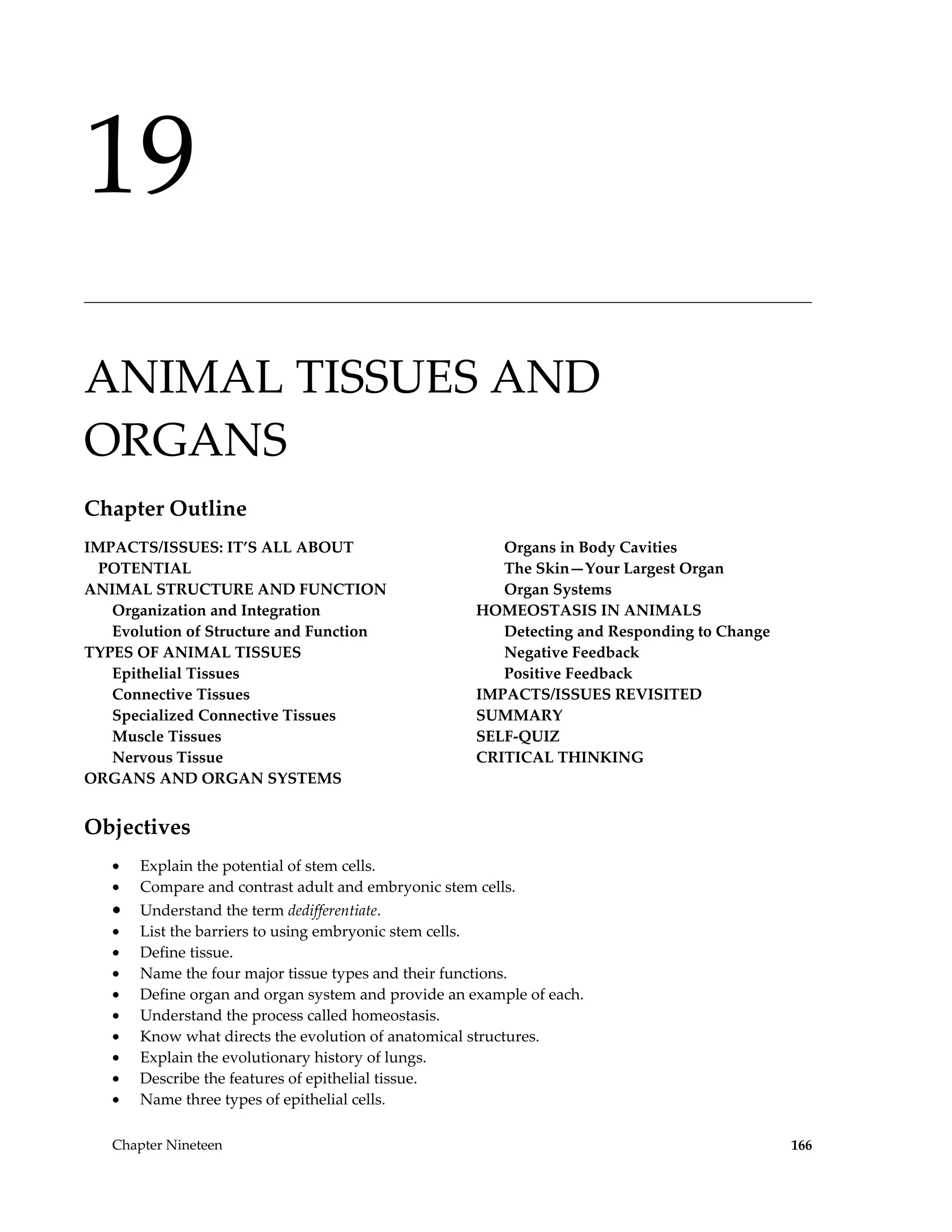 This document discusses animal tissues and organ systems. It begins by defining key terms like tissue, organ, organ system, and homeostasis. The four main tissue types - epithelial, connective, muscle and nervous tissue - are described. An organ contains multiple tissue types and works with other organs in organ systems to maintain homeostasis. Examples of organ systems that interact to regulate internal conditions like temperature are provided. The largest organ, the skin, is also overviewed in detail. Potential applications of stem cell research to regenerate tissues are noted.