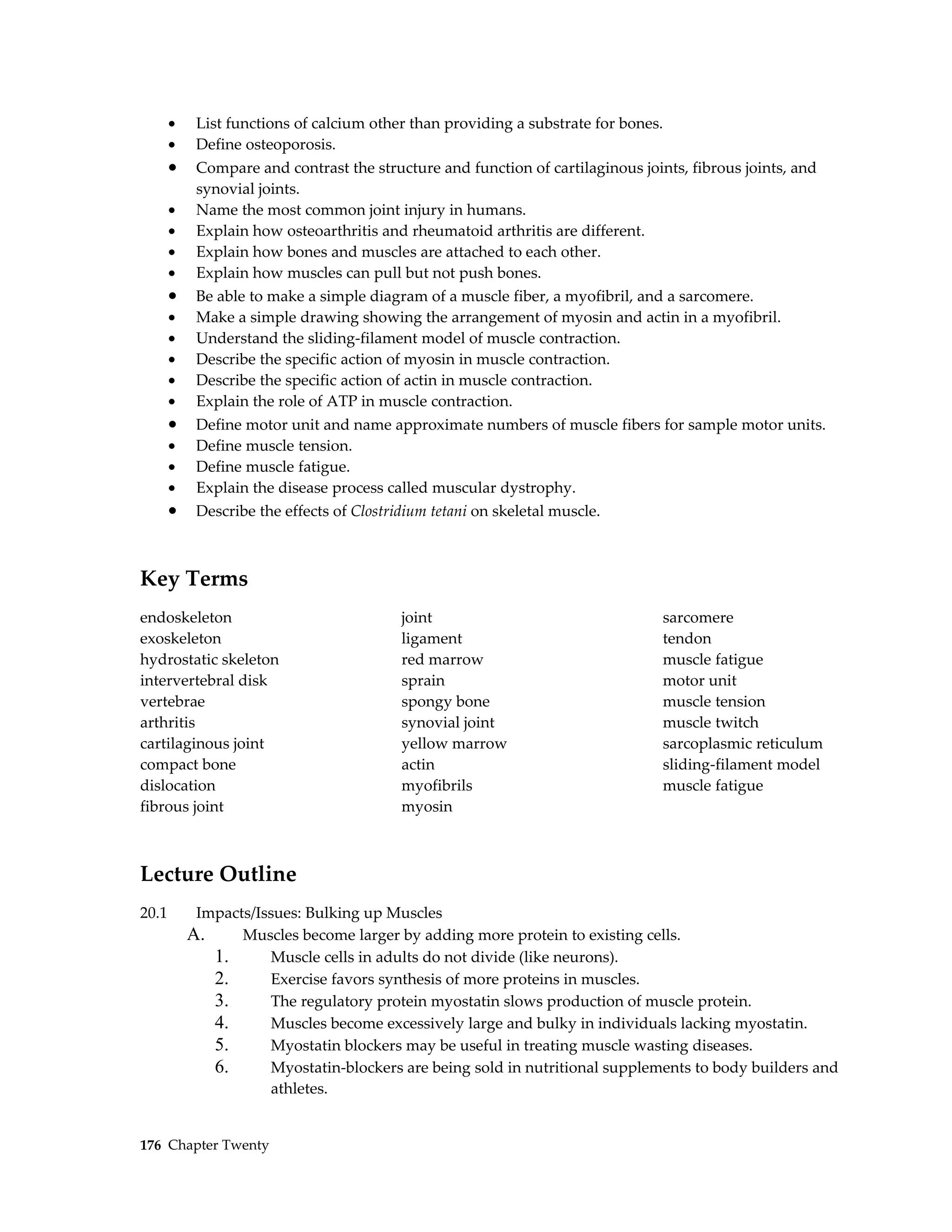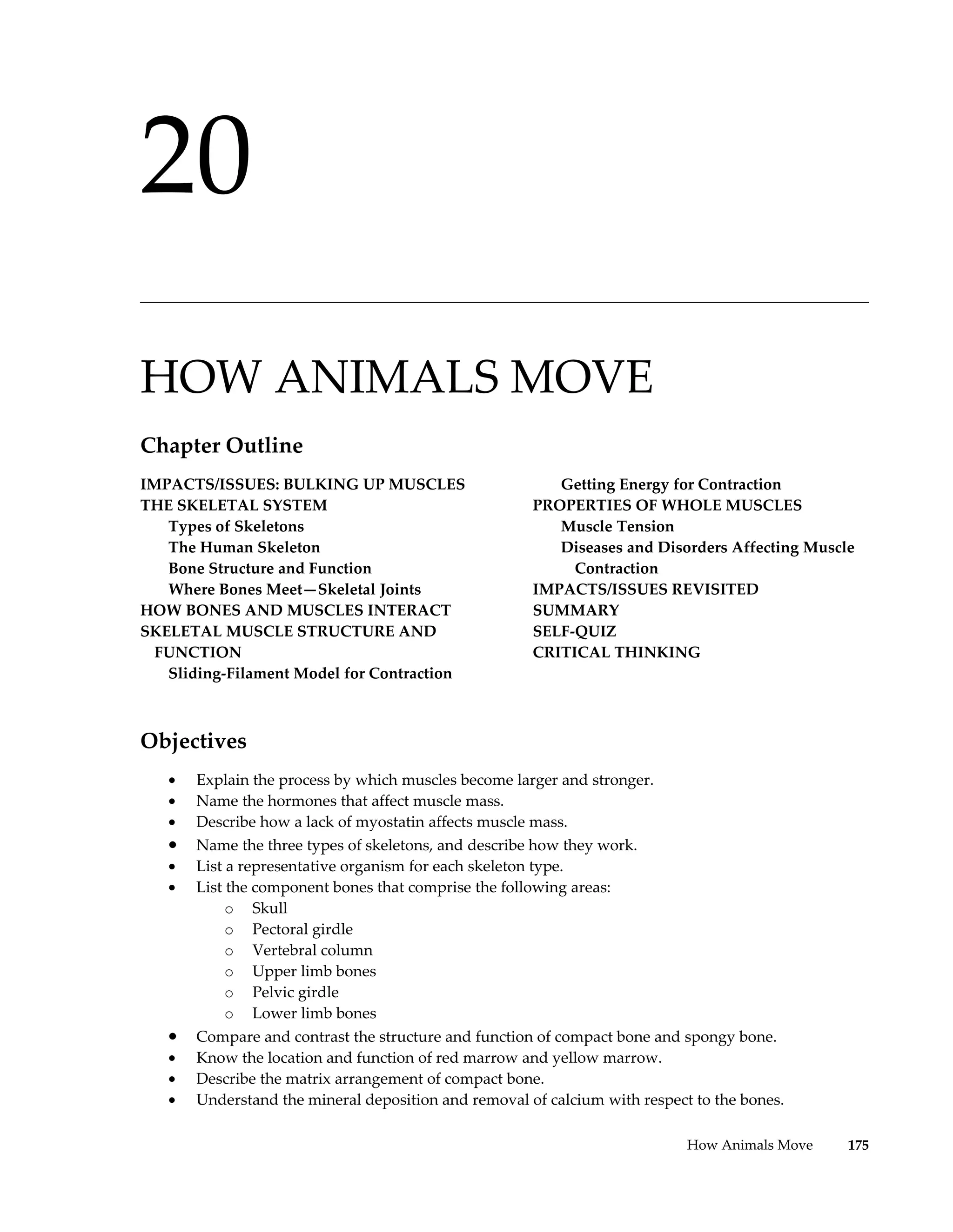 This document provides an overview of how animals move through the skeletal and muscular systems. It discusses the three types of skeletons (hydrostatic, exoskeleton, endoskeleton), focusing on the human skeletal system. It also describes the structure and function of bones, skeletal joints, and skeletal muscle. The key points are the sliding filament model of muscle contraction using actin and myosin, and how muscles interact with bones through tendons to generate movement.