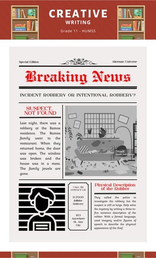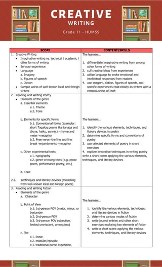 The document outlines a comprehensive curriculum on creative writing, reading, and poetry, focusing on various elements, techniques, and literary devices essential for each genre. Learners are expected to differentiate imaginative writing from other forms, analyze poetry elements, and apply literary techniques in their writing. The curriculum includes activities and objectives aimed at enhancing students' creative expression and understanding of literary artistry.