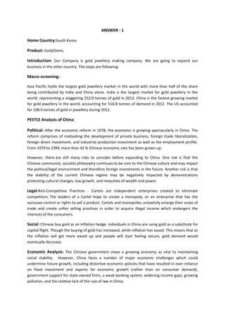 This document provides a marketing plan for a South Korean gold and gemstone jewelry company expanding into India. It begins with an analysis of the gold jewelry markets in India and China. India is selected as the target market due to its large population, fast growing economy, cultural traditions involving gold, and more lenient policies for foreign companies compared to China. A PESTLE analysis of India highlights opportunities in the jewelry industry. A competitor analysis identifies major players and applies Porter's Five Forces. The plan then outlines product, place, price, and promotion strategies for entering the Indian market including variety, quality control, design, packaging, retail locations, competitive pricing, branding, and both online and offline advertising approaches.