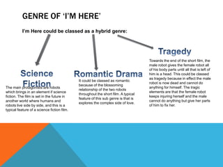 I'm Here is a science fiction romantic tragedy that explores the relationship between two robots, Sheldon and Francesca. It is set in a future world where humans dominate robots. Throughout the film, the kind male robot Sheldon gives up his body parts to repair the clumsy female robot Francesca until only his head remains. In the end, Francesca cradles Sheldon's head, showing her loyalty despite him sacrificing himself for her.
