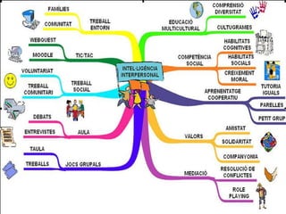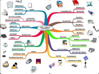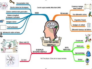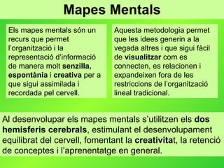 Mapes Mentals Elsmapes mentals són un recurs que permet l’organització i la representació d’informació de manera molt senzilla, espontània i creativa per a que sigui assimilada i recordada pel cervell. Aquesta metodologia permet que les idees generin a la vegada altres i que sigui fàcil de visualitzar com es connecten, es relacionen i expandeixen fora de les restriccions de l’organització lineal tradicional. Al desenvolupar els mapes mentals s’utilitzen els dos hemisferis cerebrals , estimulant el desenvolupament equilibrat del cervell, fomentant la creativita t, la retenció de conceptes i l’aprenentatge en general.