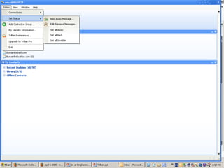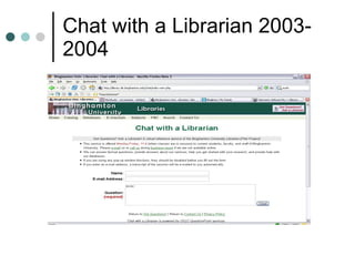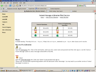 1. The document discusses the implementation of an instant messaging reference service at Binghamton University libraries using Trillian software.