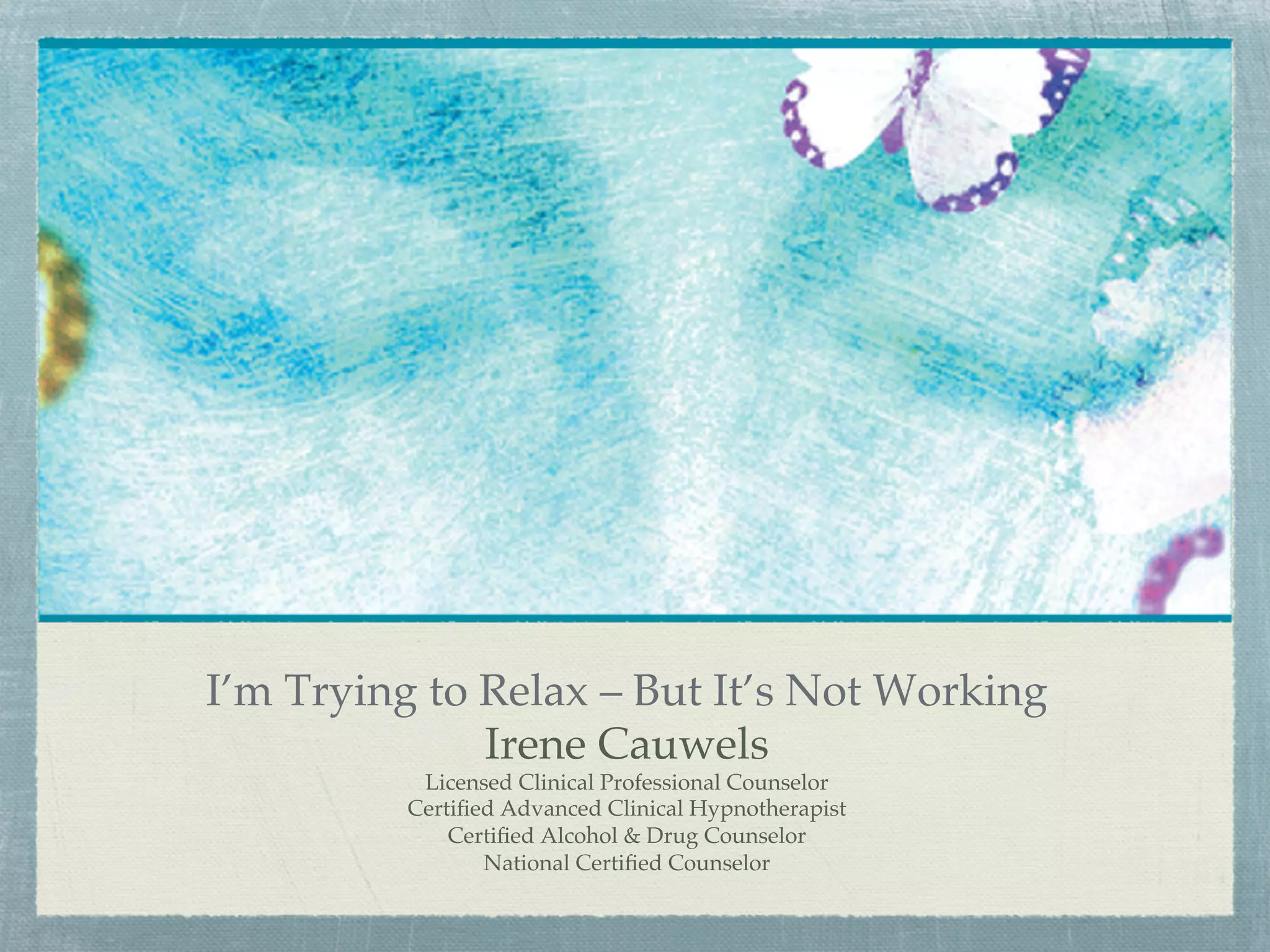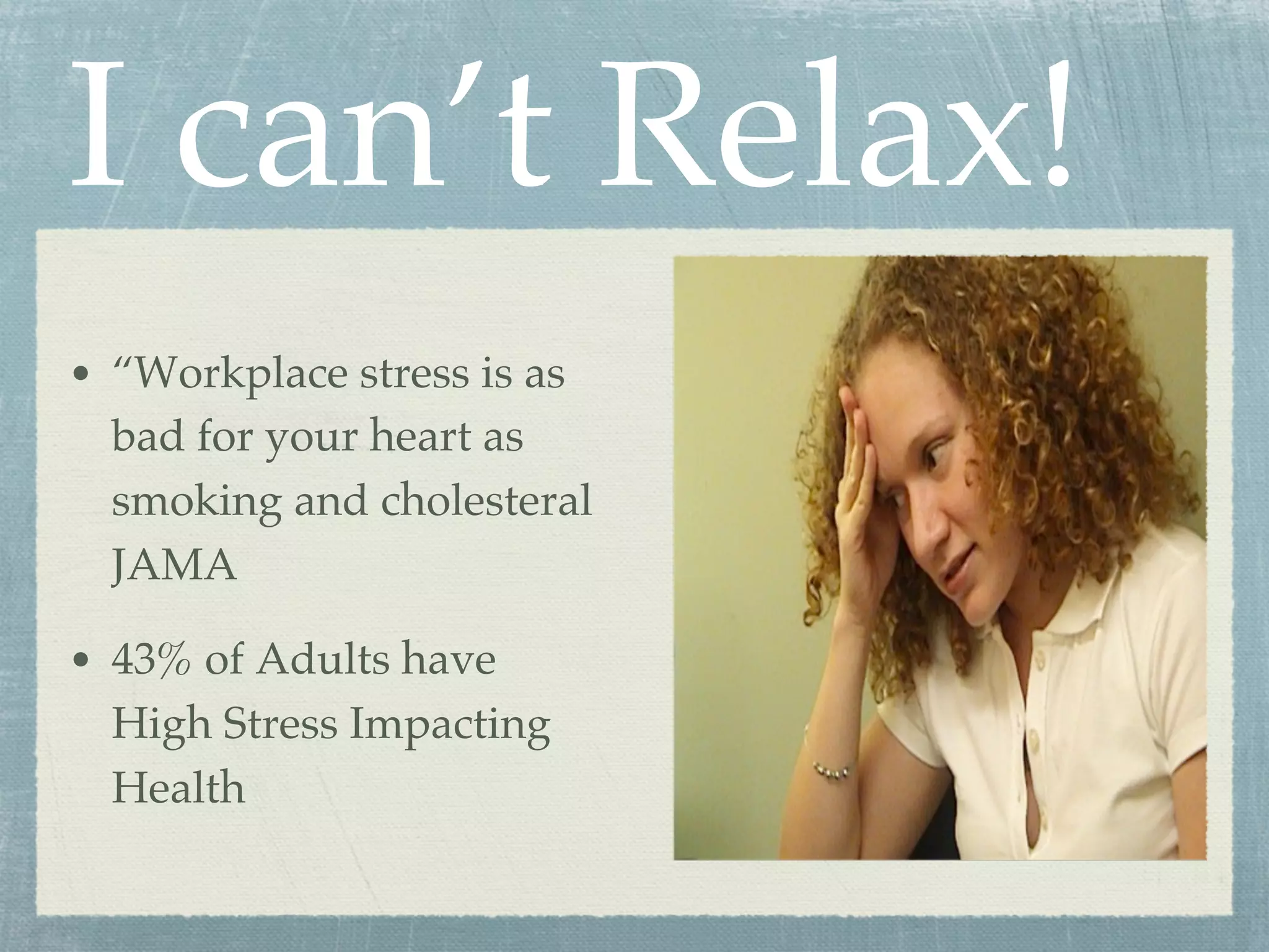 The document discusses the negative impacts of workplace stress on health, likening it to the risks of smoking. It offers various relaxation techniques such as mindfulness, breathing exercises, and self-hypnosis to combat stress and improve well-being. Additionally, it highlights the importance of connecting with one's heart and maintaining a present-focused mindset.