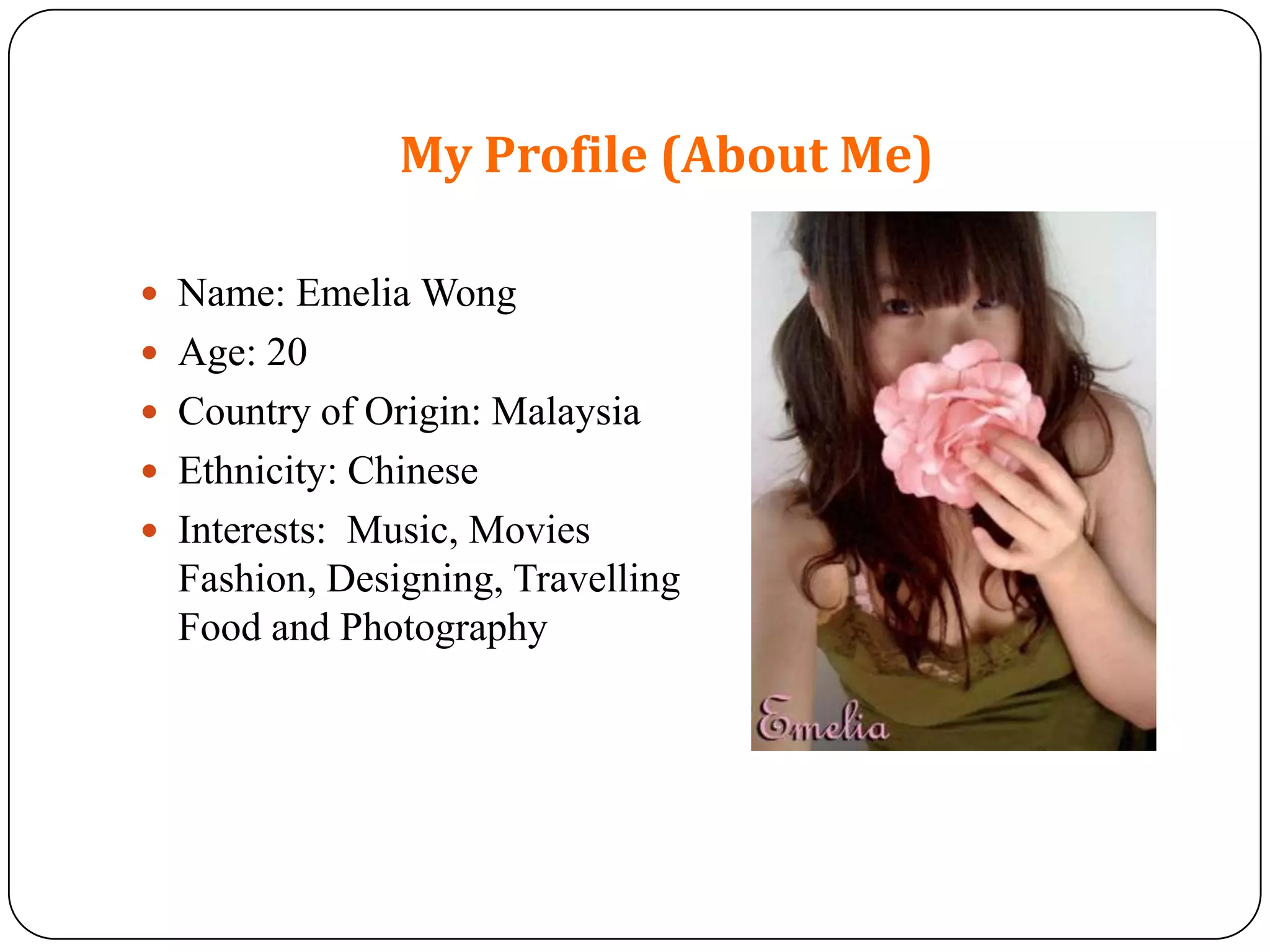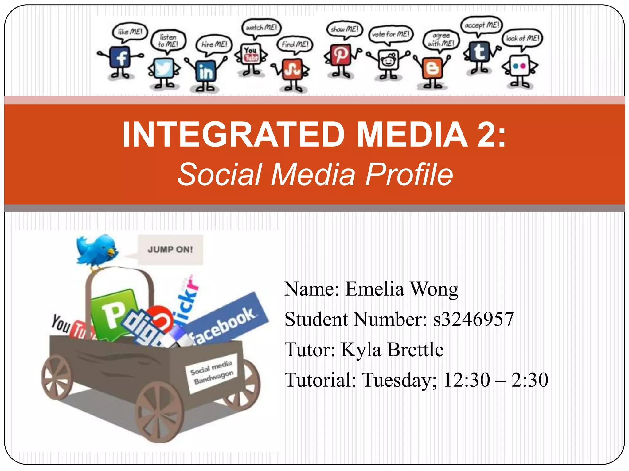 Emelia Wong is creating an integrated social media profile to showcase herself as a public relations practitioner. Her profile includes personal accounts on Facebook, Twitter, Instagram and Pinterest that display her interests in music, movies, fashion, food and photography. She also has professional accounts on LinkedIn and ABC Pool to highlight her work experiences and portfolio. Emelia aims to portray a creative, positive personality and use various social media platforms cohesively to gain recognition from potential employers.