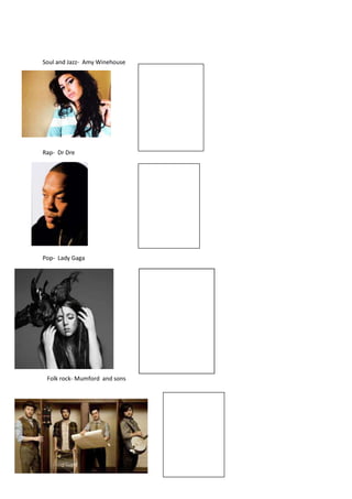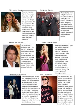 The document provides descriptions of various music artists and analyzes aspects of their images that relate to their musical genres. For Beyonce, her feminine pose and attire suggest she represents pop and R&B music. For Slipknot, their masks and dark makeup create mystery and intensity that matches their heavy metal genre. Mumford and Sons are shown with bushy hair and stubble, conveying a laid back folk rock style.