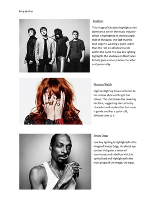 This document analyzes and summarizes various images of musical artists. It discusses how lighting, composition, and other visual elements in each image convey aspects of the artist's style, personality, and music. For example, it notes that low-key lighting in images of Kasabian and Snoop Dogg suggest dominance and character, while high-key lighting in images of Beyonce and Kanye West imply power and determination. Color, positioning of subjects, and uses of space are also examined in relation to the artists' brands and music genres.