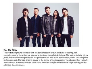 This document analyzes and summarizes several band photos based on composition, clothing, and context clues. Key points noted include how lead singers are typically positioned in the center to draw focus, black and white filters suggest an "old style", casual clothing and poses imply a less serious approach, and stylish outfits hint at fashionable genres like rock. Context clues about tattoos, graffiti, and surroundings provide additional insights into possible musical styles. Overall, the document examines visual elements that convey information about bands and their music.