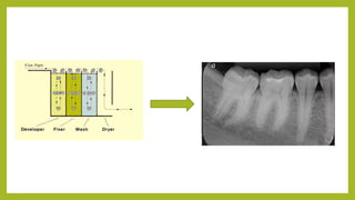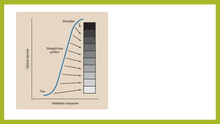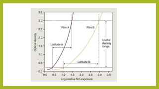 This document discusses various image characteristics that affect the quality of a radiograph. It defines key terms like radiopaque, radiolucent, and optical density. It explains how factors like kilovoltage, milliamperage, exposure time and distance affect radiographic density. The document also discusses contrast, speed, latitude and other characteristics. In summary, it provides a comprehensive overview of the technical factors that determine image quality and the diagnostic value of a radiograph.