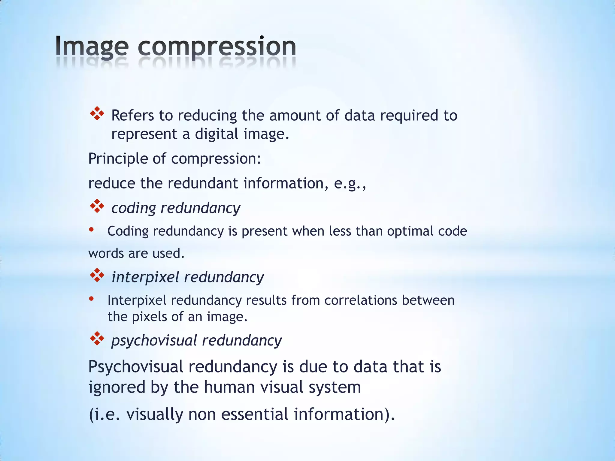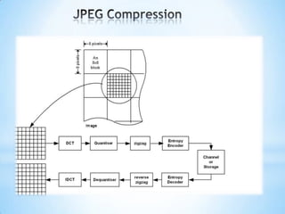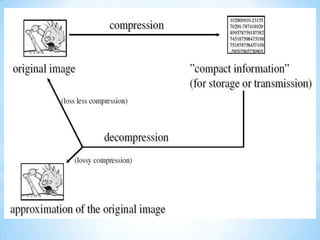 This document discusses image compression techniques. It explains that the goal of compression is to reduce the amount of data needed to represent a digital image by eliminating redundant information like coding, interpixel, and psychovisual redundancies. Compression can be lossy or lossless. Lossy methods allow for data loss but provide higher compression, while lossless preserves all image data. Common lossy techniques include JPEG, which uses discrete cosine transform and quantization, and lossless methods include run length and Huffman encoding.