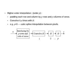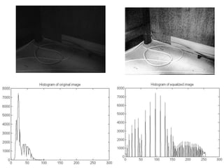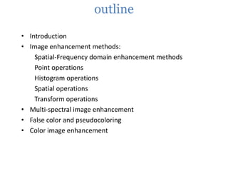 This document provides an overview of various image enhancement techniques. It begins with an introduction to image enhancement and its objectives. It then outlines and describes several categories of enhancement methods, including spatial-frequency domain methods, point operations, histogram operations, spatial operations, and transform operations. Specific techniques discussed in detail include contrast stretching, clipping, thresholding, median filtering, unsharp masking, and principal component analysis for multispectral images. The document also covers color image enhancement and techniques for pseudocoloring.
