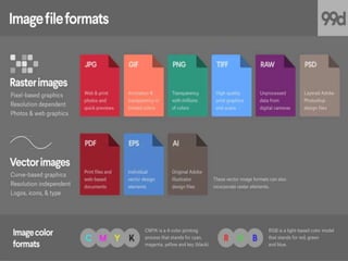 The document discusses various image file formats including raster formats like JPEG, GIF, PNG, TIFF, RAW and PSD as well as vector formats like PDF, EPS and AI. It provides details on when each format should and should not be used based on factors like whether the image needs editing, printing, use online or in email. Raster formats are optimized for photos while vector formats maintain quality when resized. The document aims to help users choose the best format for different image uses and projects.