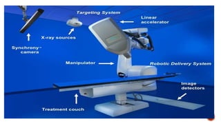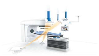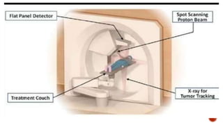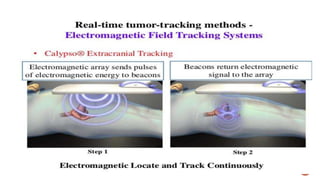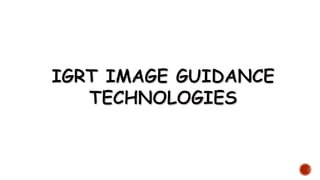 This document discusses image-guided radiation therapy (IGRT) and various IGRT techniques. It describes how IGRT aims to increase the accuracy and precision of radiotherapy delivery by applying image-based target relocalization. Common IGRT techniques mentioned include portal imaging, on-board cone-beam CT (CBCT), in-room CT, ultrasound and real-time tumor tracking. CBCT allows visualization of the tumor location using kilovoltage or megavoltage X-rays rotating around the patient. Real-time tumor tracking involves synchronizing radiation delivery with the respiratory cycle using implanted fiducial markers and fluoroscopy.
