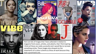 Bethany Barrows has collected many images that could inspire the front covers, articles, and advertisements for her magazine. These images demonstrate successful uses of color schemes and styles of poses that look natural. They also show that a black background works well and could be used for her upcoming photo shoot. Some of the concert pictures may also be relevant to include since her magazine is about music and she plans to include a concert ticket giveaway.