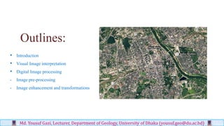 The document discusses techniques for extracting information from visual and digital images. It outlines methods for visual image interpretation using elements like tone, shape, size, pattern, texture, shadow and association. It also discusses digital image processing techniques including pre-processing methods like radiometric and geometric corrections, and enhancement methods like filtering, transformations and indices. The goal is to extract useful information from remote sensing imagery for analysis.