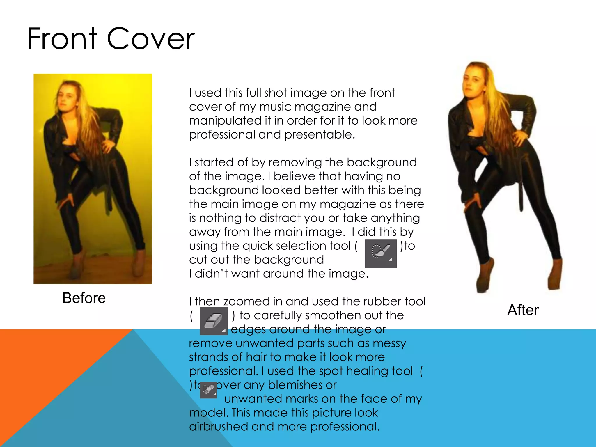 The document discusses how the author manipulated several images for a music magazine to make them look more professional and presentable. For images used on the front cover and contents page, the background was removed and edges were smoothed using selection, eraser, and healing tools. Colors and lighting were also adjusted. For a double page spread, the image was cropped and converted to black and white to look effective while keeping the original background. The manipulations focused on removing distractions and making the images stand out on the pages.