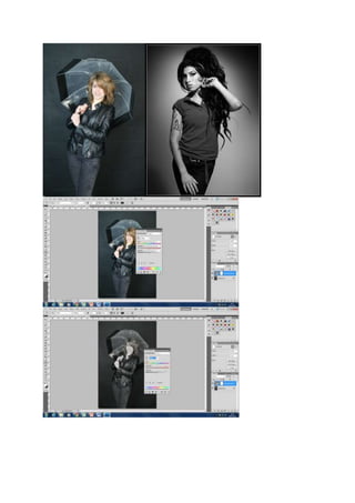 The document discusses editing a photo of Amy Winehouse to be black and white to match a color scheme and create a dramatic effect. The saturation and lighting of the image were adjusted to achieve a realistic black and white look. This edited main image was enlarged to cover more space on a double page spread, drawing the reader's eye as the large central focus of the two pages.