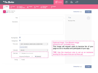 - Fan blocker, flyer, form, end of promotion, participant, and tab images of specified minimum and maximum sizes