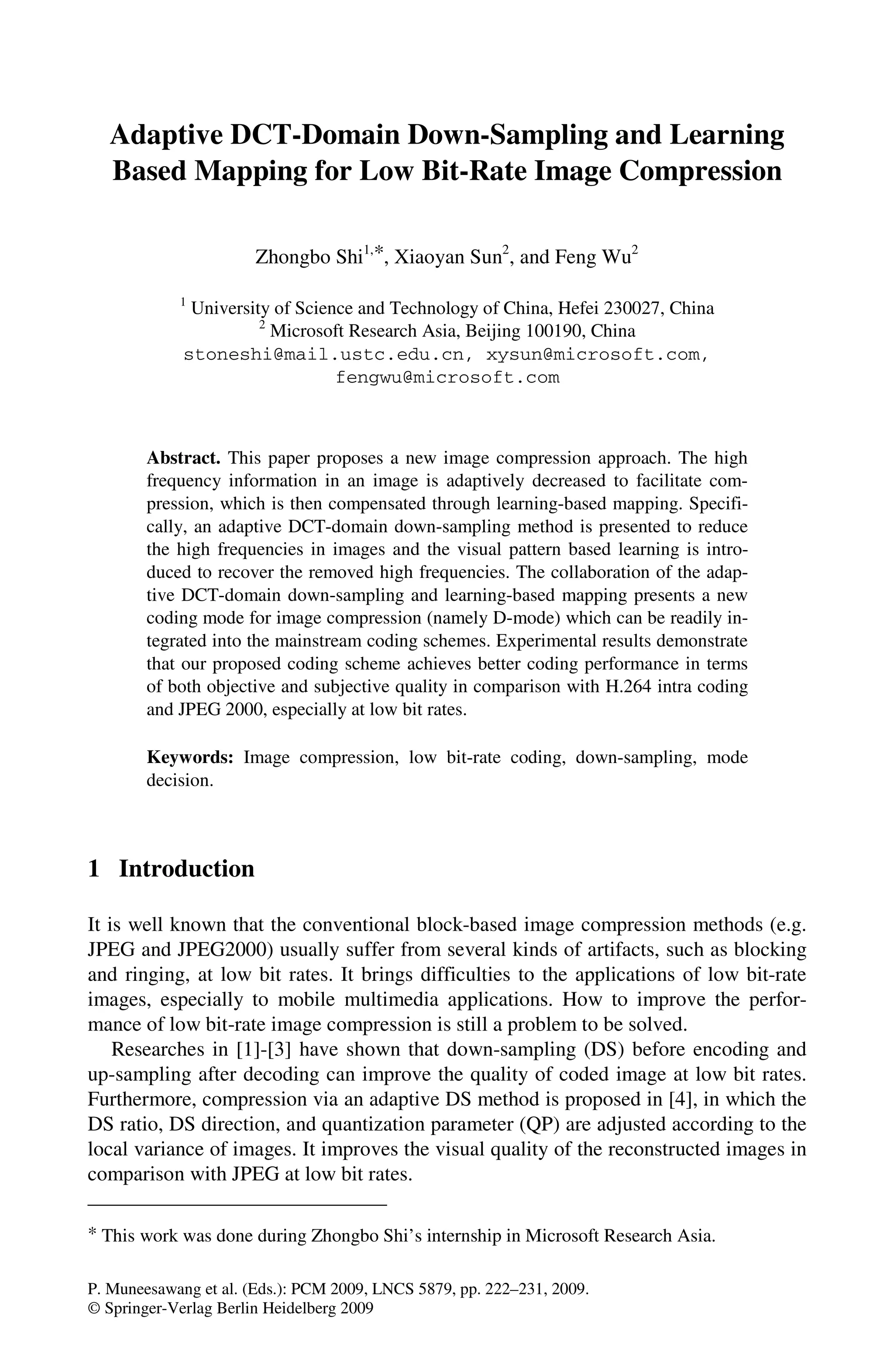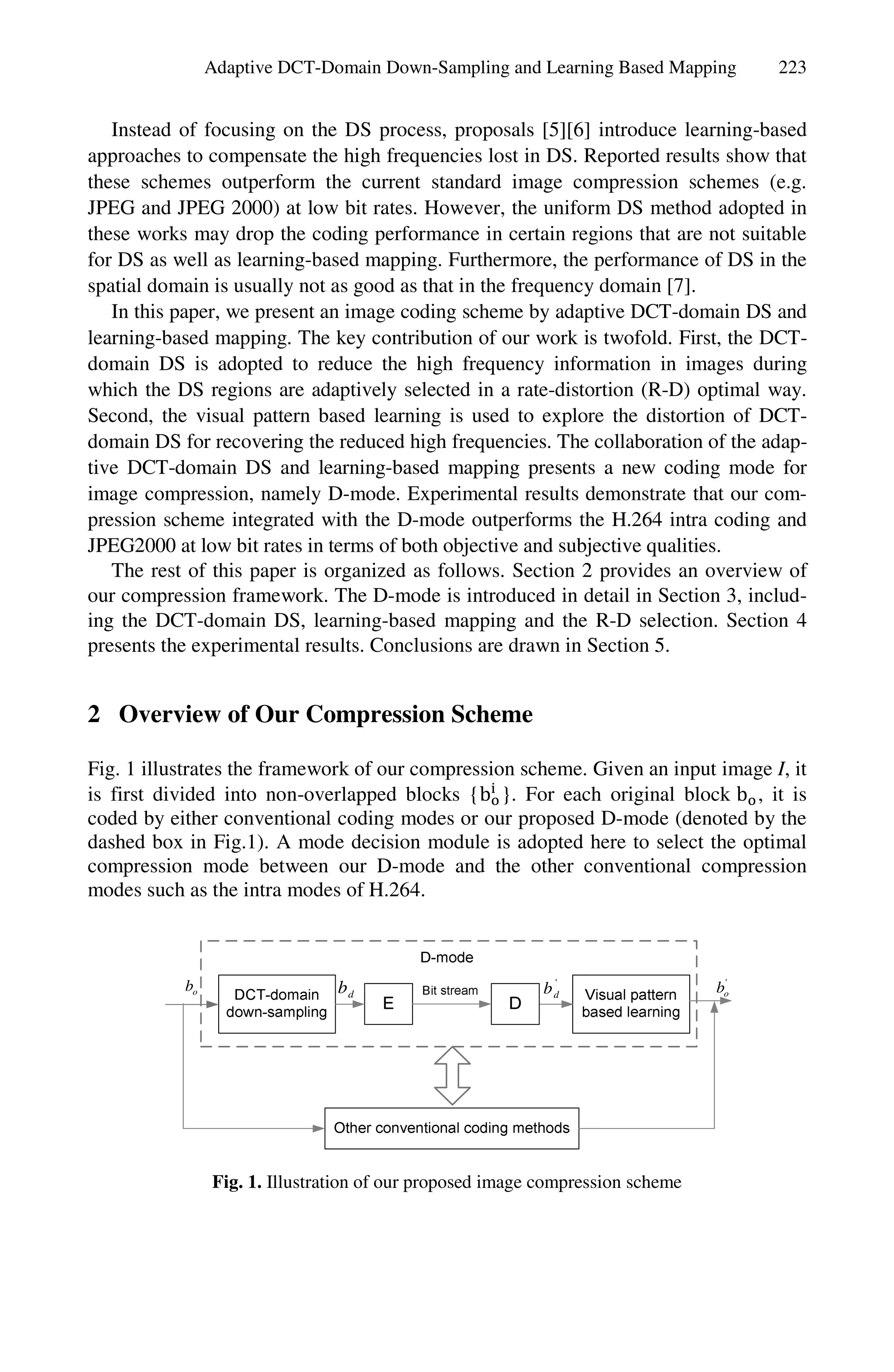 This paper proposes a new image compression approach that uses adaptive DCT-domain downsampling to reduce high frequency information in images for compression, and then uses learning-based mapping to compensate for the removed high frequencies during decompression. Specifically, it adaptively selects regions for downsampling in the DCT domain based on rate-distortion optimization. It then uses a database of visual patterns to map blurred image patches to corresponding high-quality patches during decompression, recovering lost high frequencies. Experimental results show it outperforms standards like H.264 and JPEG2000 especially at low bit rates.