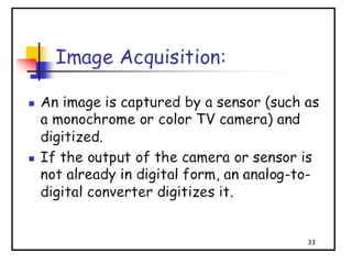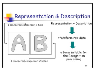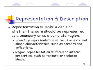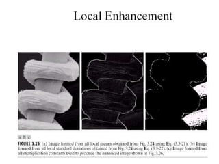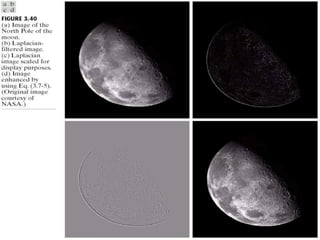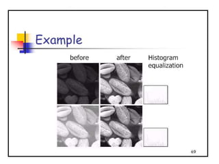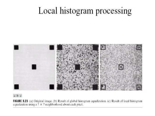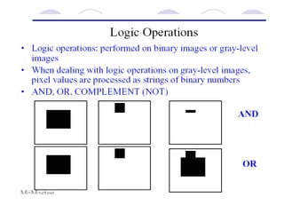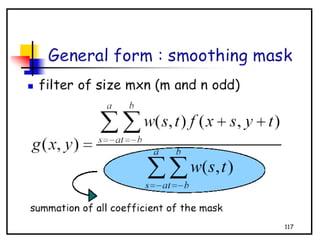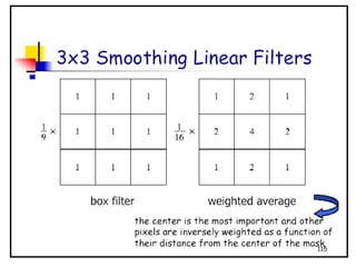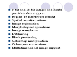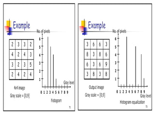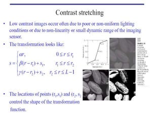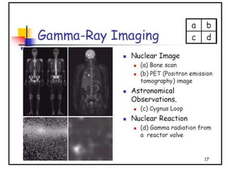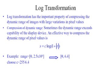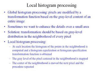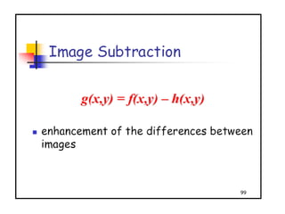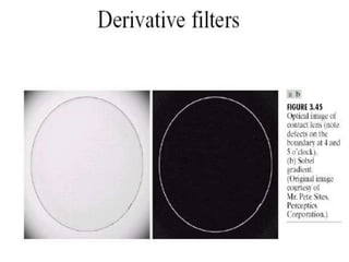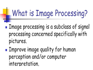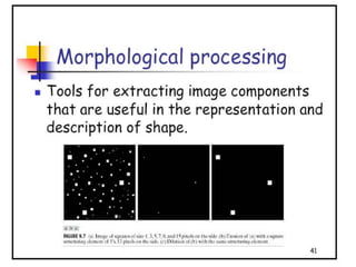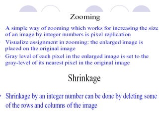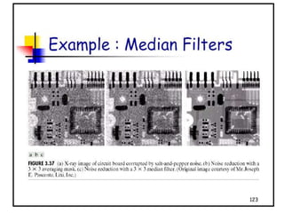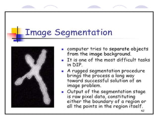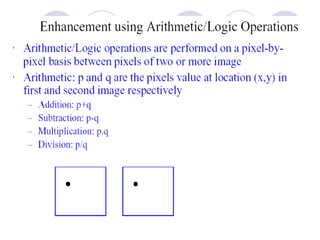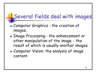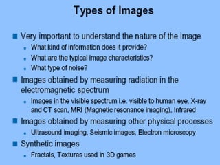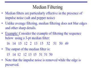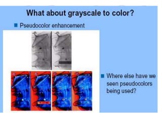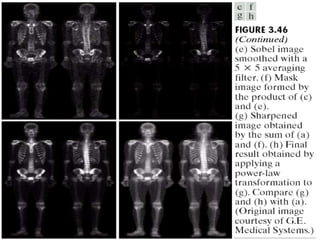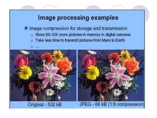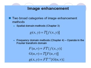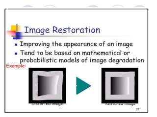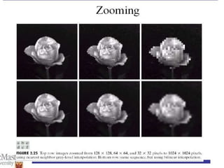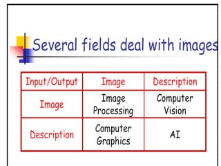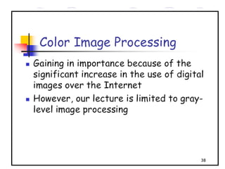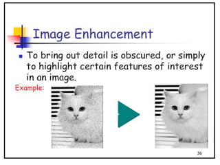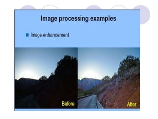 - The course covers topics like image processing applications, enhancement techniques, restoration, segmentation, and scene analysis. It also covers specific techniques like using neural networks and parallel algorithms for image processing.