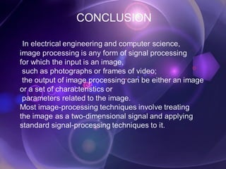 This document discusses image processing and its various applications and techniques. It defines image processing as processing images in a desired manner and explains it has two aspects: improving visual appearance for humans and preparing images for feature measurement. It describes why image processing is needed such as preparing digital images for viewing and optimizing images for applications. It also outlines different types of image processing like image-to-image, image-to-information, and information-to-image transformations.