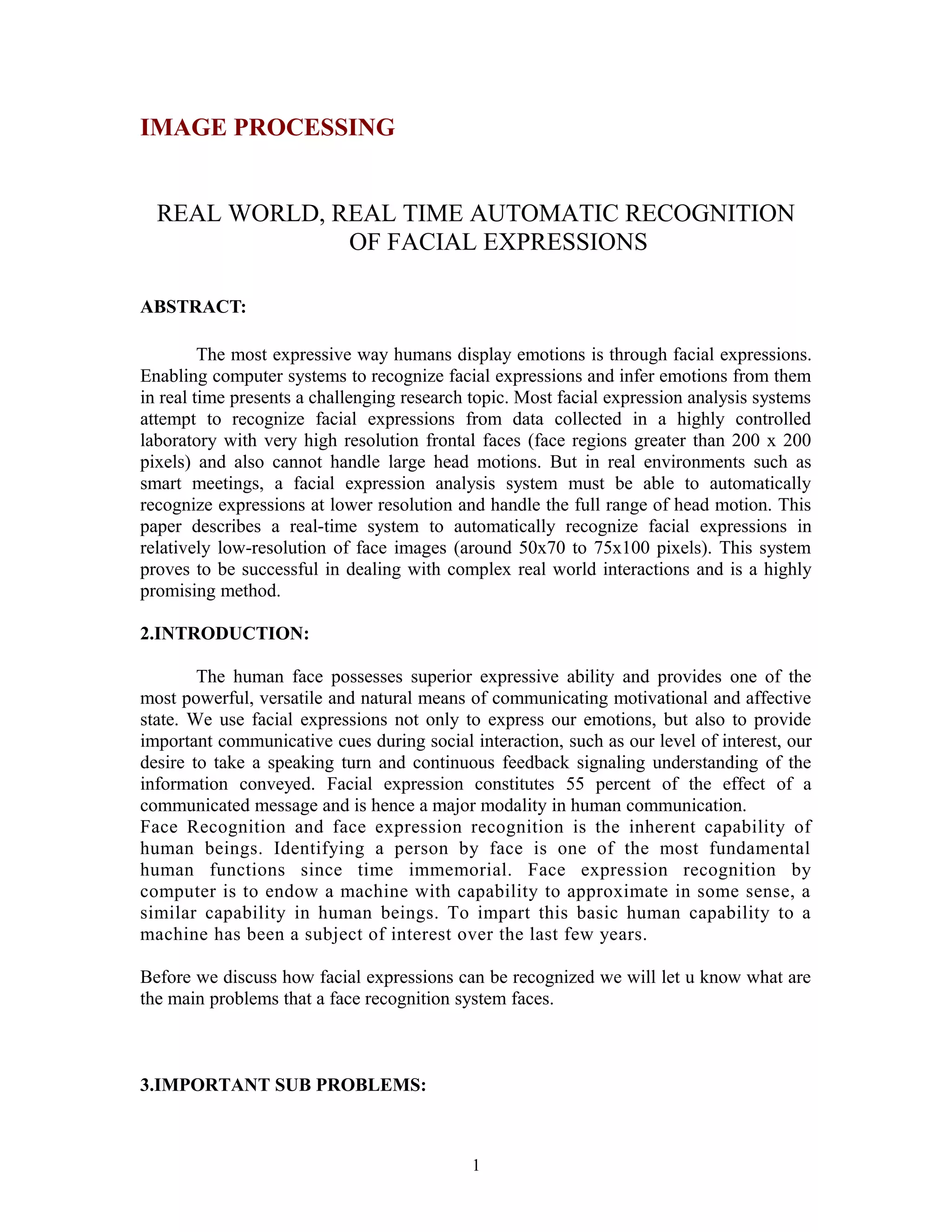 This document describes a real-time facial expression recognition system that can handle low-resolution images and full head motion in real-world environments. The system uses background subtraction, head detection and pose estimation to analyze faces. It extracts location features like eye and mouth positions and shape features of the mouth region. A neural network then recognizes expressions like smile, anger and surprise from the features. The system aims to automatically recognize expressions in challenging real-world conditions like those in meetings, addressing limitations of prior systems.