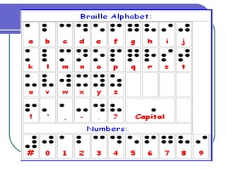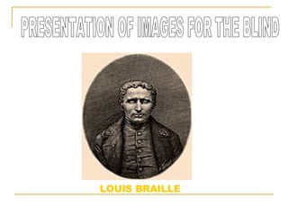 This document summarizes a presentation about developing a system to present images to blind people through tactile images. The system uses an image scanner and computer to process photographs into simple tactile representations that can be understood through touch. Key image processing techniques like edge detection, thresholding, and scaling are used to extract important attributes and convert images into patterns that are printed on braille paper. While losing detail, preliminary results found the tactile images effectively conveyed aspects of faces, leaves, and medical scans to blind users. Further work aims to develop a fully independent system for blind people to process and explore images through touch.