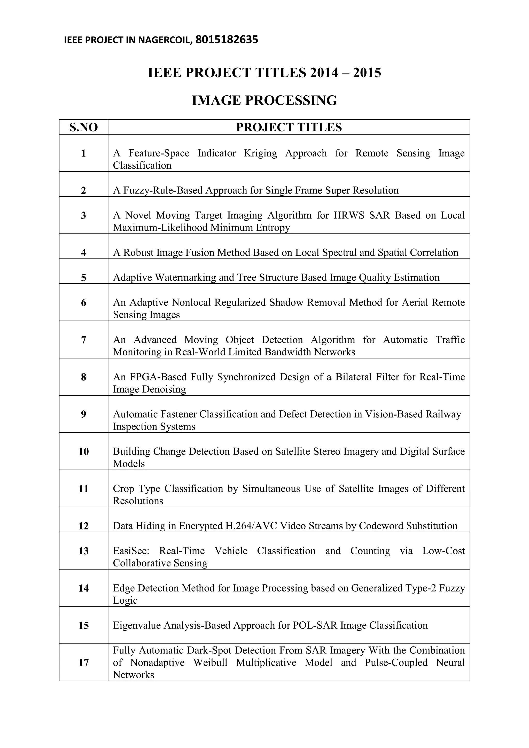 This document lists 32 image processing project titles from 2014-2015. The projects cover a wide range of topics including remote sensing image classification, super resolution, moving target imaging in SAR, image fusion, quality estimation, shadow removal, object detection, bilateral filtering, inspection systems, change detection, crop classification, data hiding, vehicle classification and counting, edge detection, classification, dark spot detection, color morphology, license plate detection, food calorie analysis, target analysis, segmentation, camera planning, text detection, resizing, building extraction, volume estimation, satellite image analysis, land cover classification, histogram equalization, and vehicle reidentification for travel time estimation.