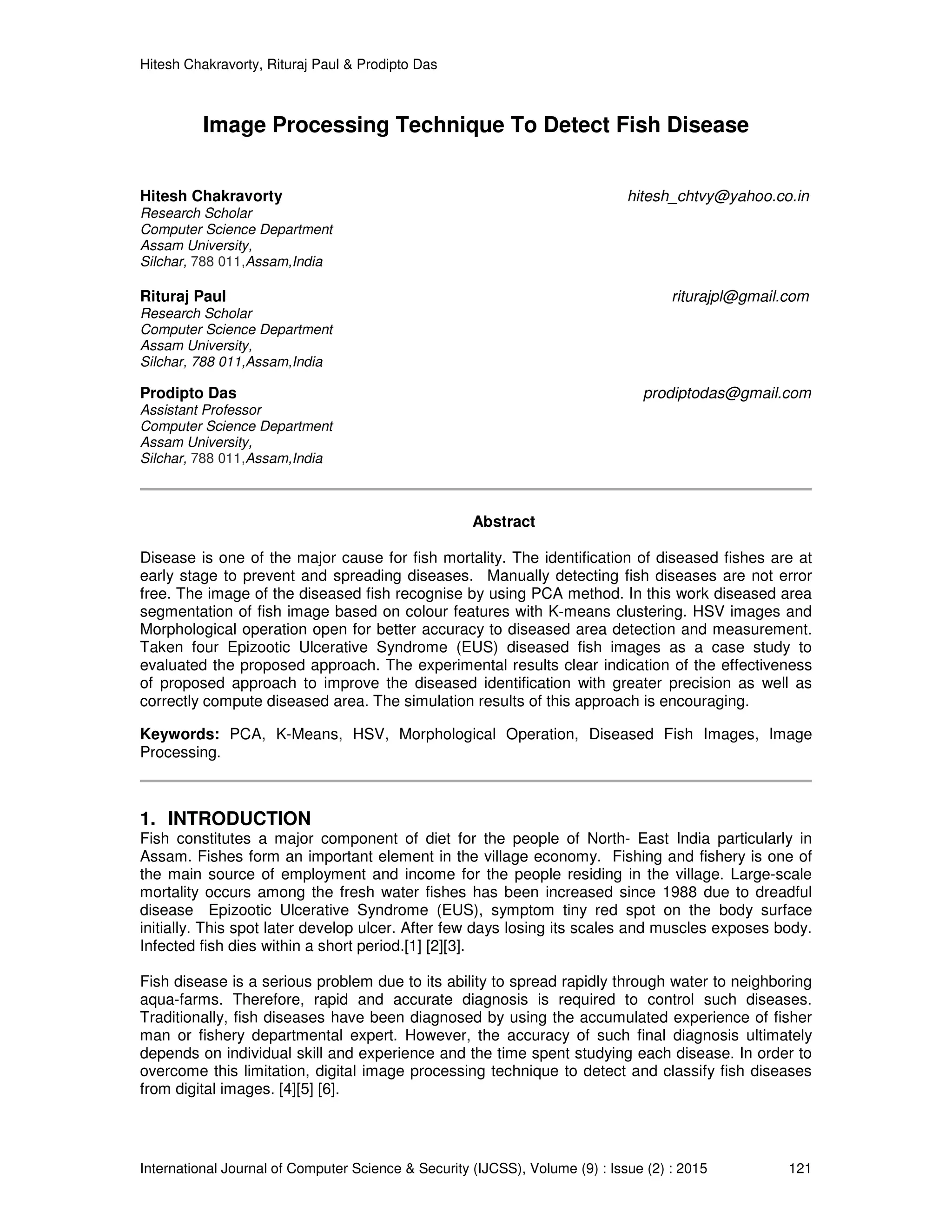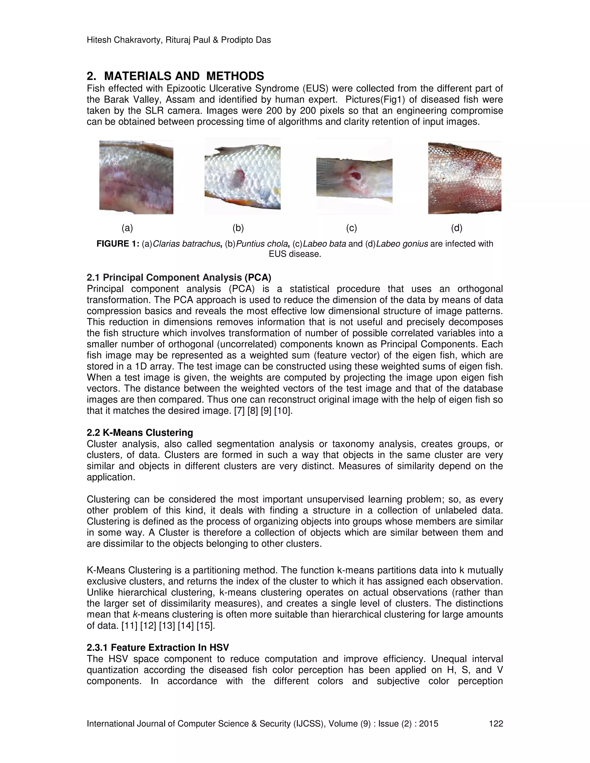 The document presents a study on using image processing techniques to detect fish diseases, particularly epizootic ulcerative syndrome (EUS), which causes high mortality among fish. It employs principal component analysis (PCA) for disease identification and k-means clustering for segmenting the diseased areas in digital images, resulting in effective detection with over 90% accuracy. The findings suggest that digital image processing could significantly enhance disease management in fisheries, though further research is needed on more sophisticated techniques.