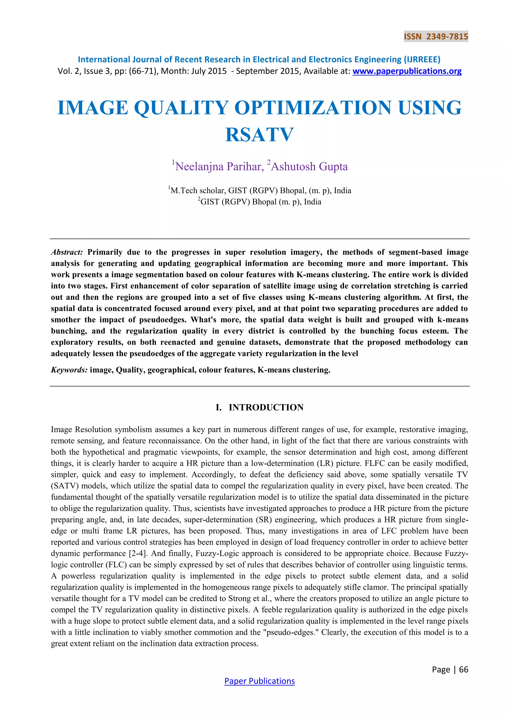 The document presents a method for image quality optimization using a region-based spatially adaptive total variation (rsatv) algorithm combined with k-means clustering for image segmentation. The proposed approach enhances color separation of satellite images and effectively reduces noise in flat regions while preserving edge details, demonstrating improvements over traditional methods. Experiments on both simulated and real datasets indicate significant enhancements in image resolution and quality, with plans for future research on adaptive parameter selection and efficient optimization algorithms.