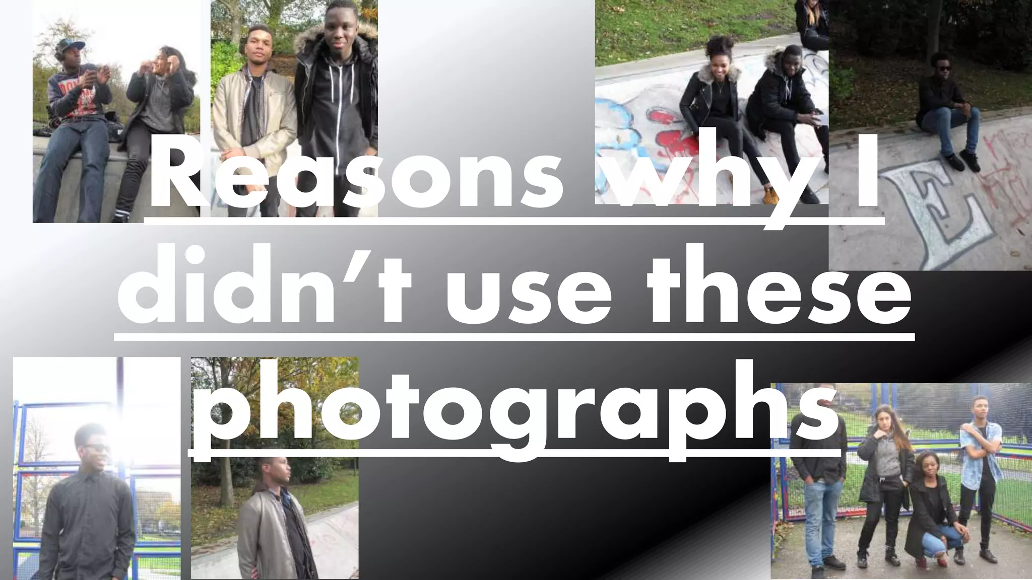 The document discusses reasons why certain photographs were not used for various sections of a magazine. The main image was not used because the models were not properly posed. Contents page images were rejected due to excessive lighting, irrelevant backgrounds, and unnecessary objects in frame. Additional contents page images were too blurry or had distracting backgrounds. Double spread images were deemed unprofessional, not related to music, or featured uncomfortable or unfocused models without eye contact.