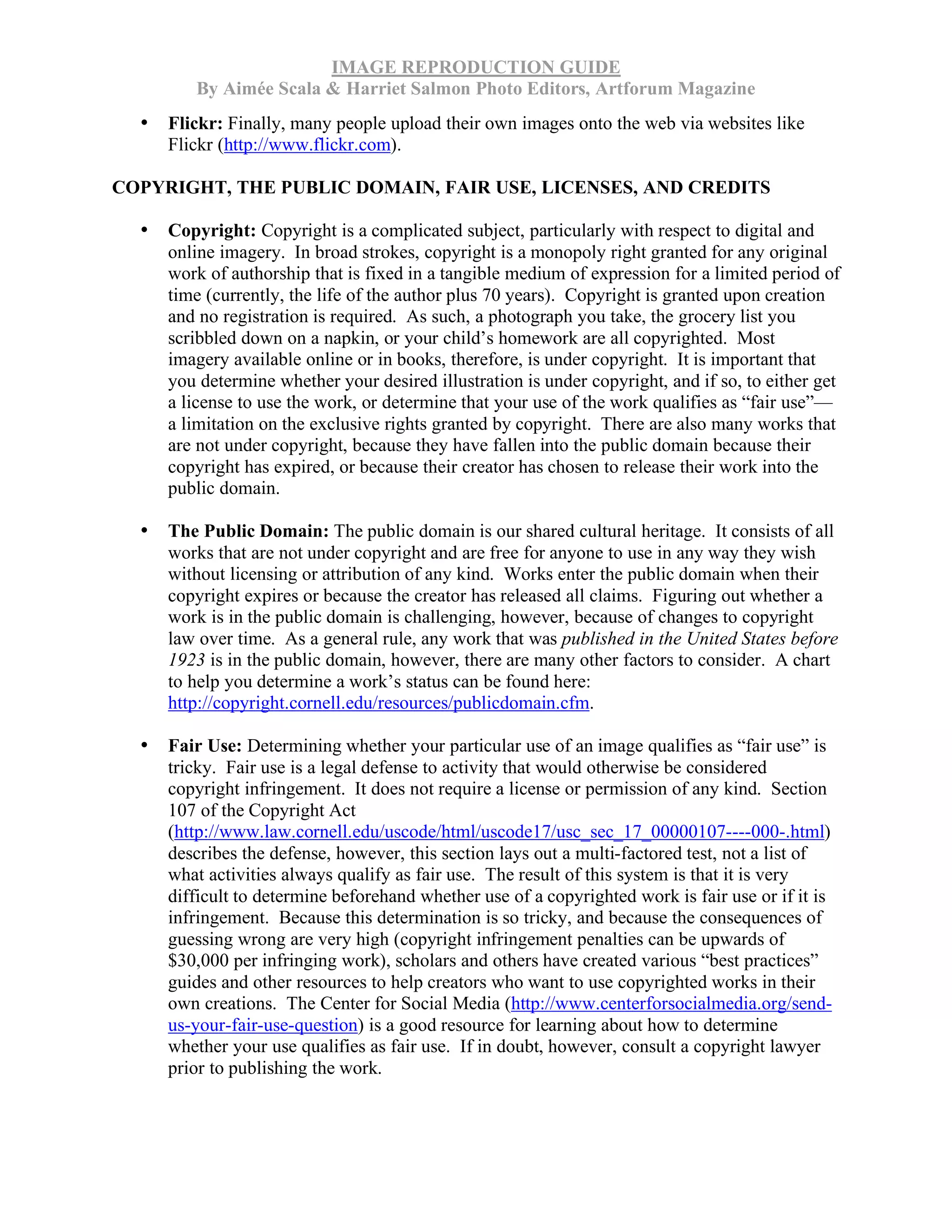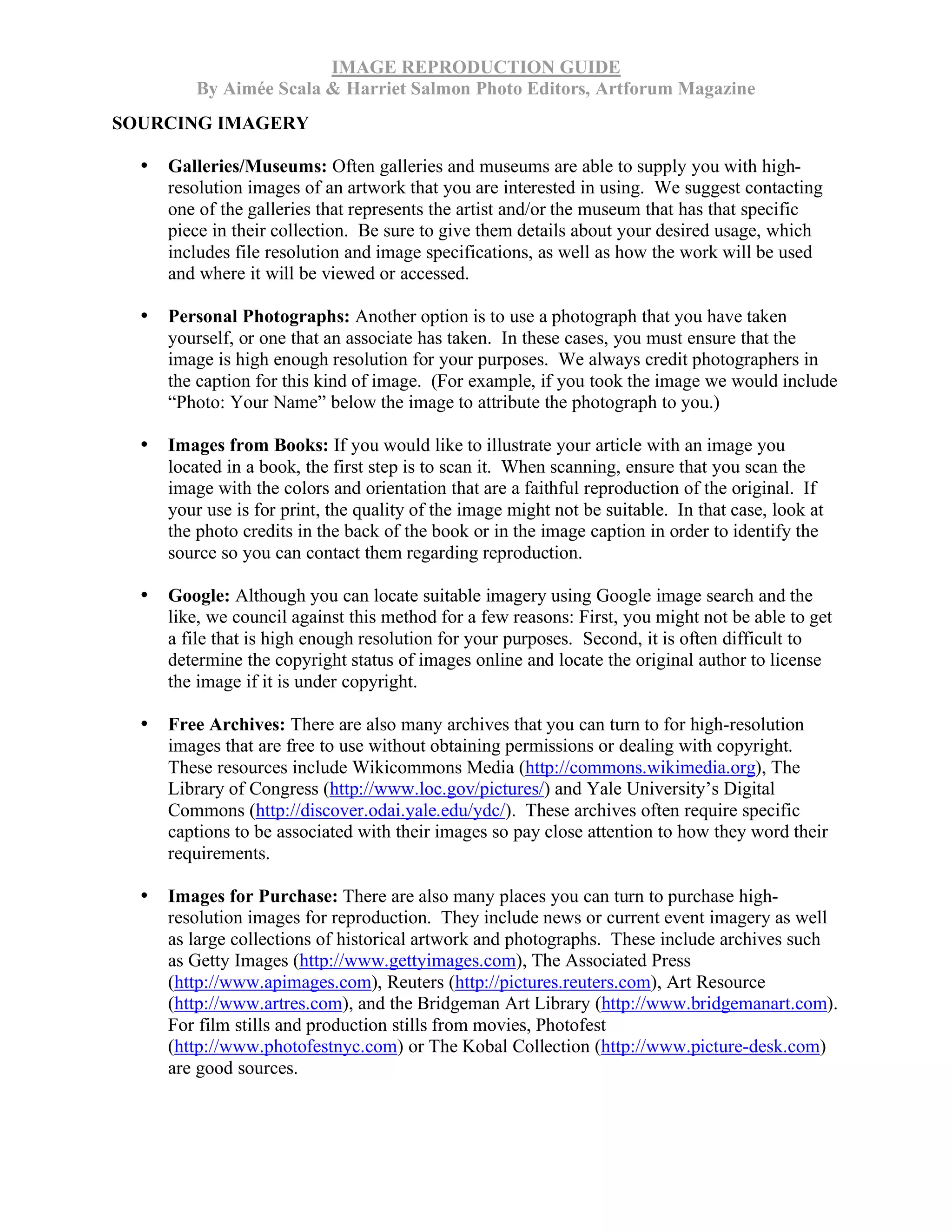 The document provides guidance on sourcing and reproducing images for publication. It discusses obtaining images from galleries, museums, personal photographs, books, free archives, and purchasing images. It covers copyright, the public domain, fair use, licenses, and the importance of proper attribution and credits. Guidelines are provided for determining if a work's copyright has expired, if fair use applies, understanding creative commons licenses, and contacting artist rights organizations when using images of artworks.
