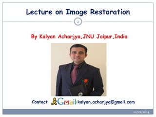 The document is a lecture presentation on image restoration in digital image processing, covering fundamental concepts such as degradation models, noise types, estimation methods, and restoration techniques. It differentiates between image enhancement and restoration, emphasizing the importance of known degradation models for restoring degraded images. Advanced restoration techniques and practical applications are also discussed, along with acknowledgements to various academic resources.