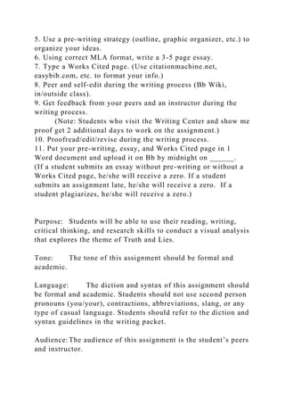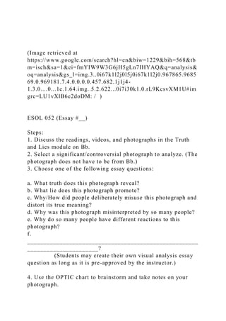 The document outlines an academic assignment focused on visual analysis of photographs, emphasizing the exploration of themes related to truth and lies. It includes detailed steps for students to analyze a chosen photograph, write an essay in MLA format, and use specific pre-writing and editing strategies. Successful completion requires adherence to formal language and proper citation practices while engaging with various sources.