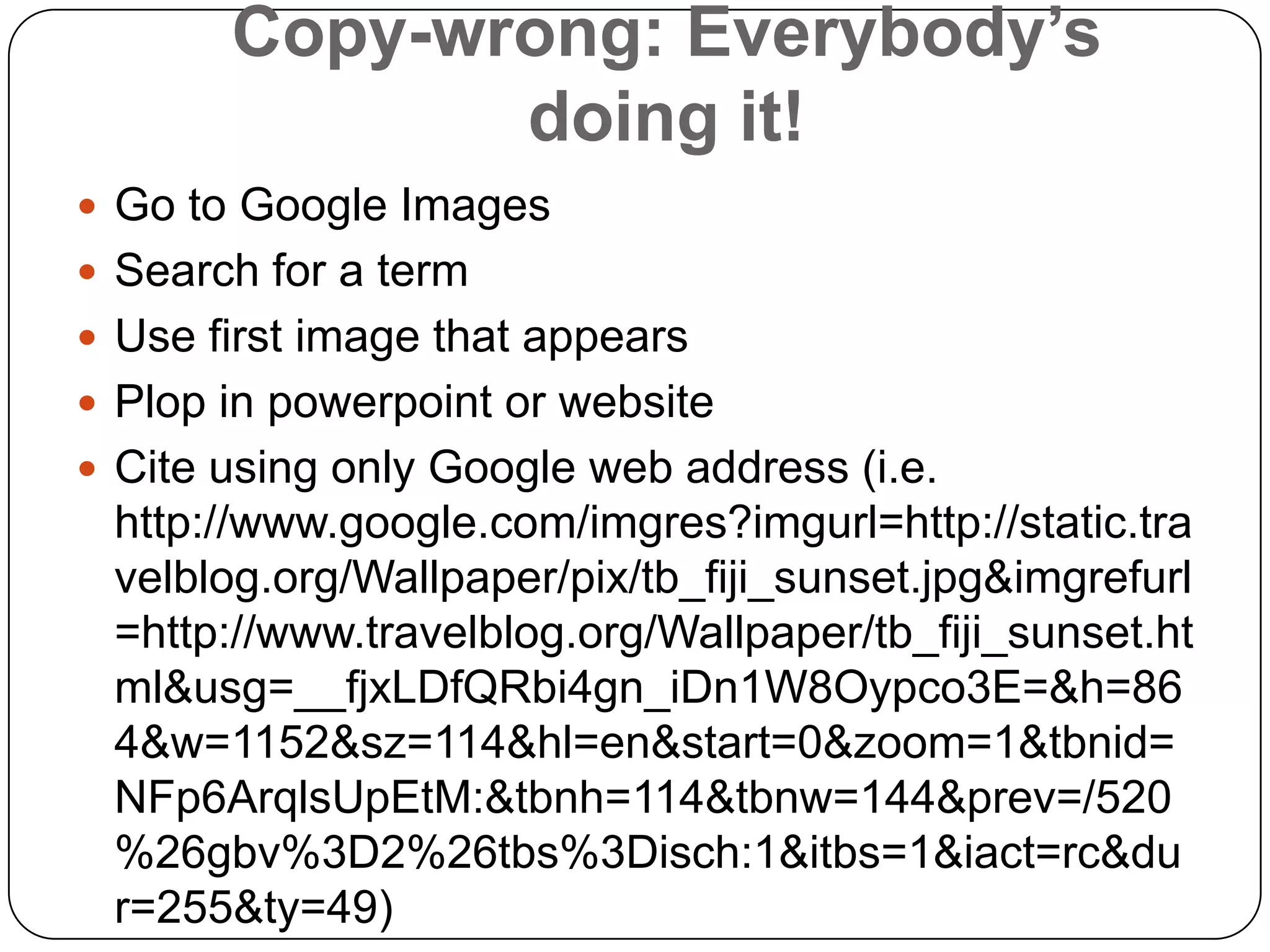 This document discusses copyright and fair use as they apply to using images in educational settings. It notes that simply copying images from Google is copyright infringement. Fair use allows some educational use of copyrighted works if it transforms the original and meets other criteria. Educators should model proper citation of images, encourage students to find open-licensed works, and use the fair use analysis process for any copyrighted content. Providing attribution and not replacing creative effort are important limitations.