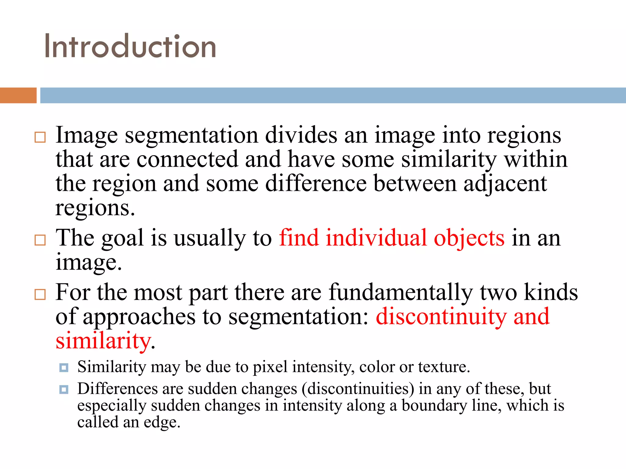 This document discusses different techniques for image segmentation. It begins by defining image segmentation as dividing an image into regions based on similarity and differences between adjacent regions. The main approaches discussed are discontinuity-based segmentation, which looks for sudden changes in pixel intensity (edges), and similarity-based segmentation, which groups similar pixels into regions. The document then examines various methods for detecting edges, linking edges, thresholding, and region-based segmentation using techniques like region growing and splitting/merging.