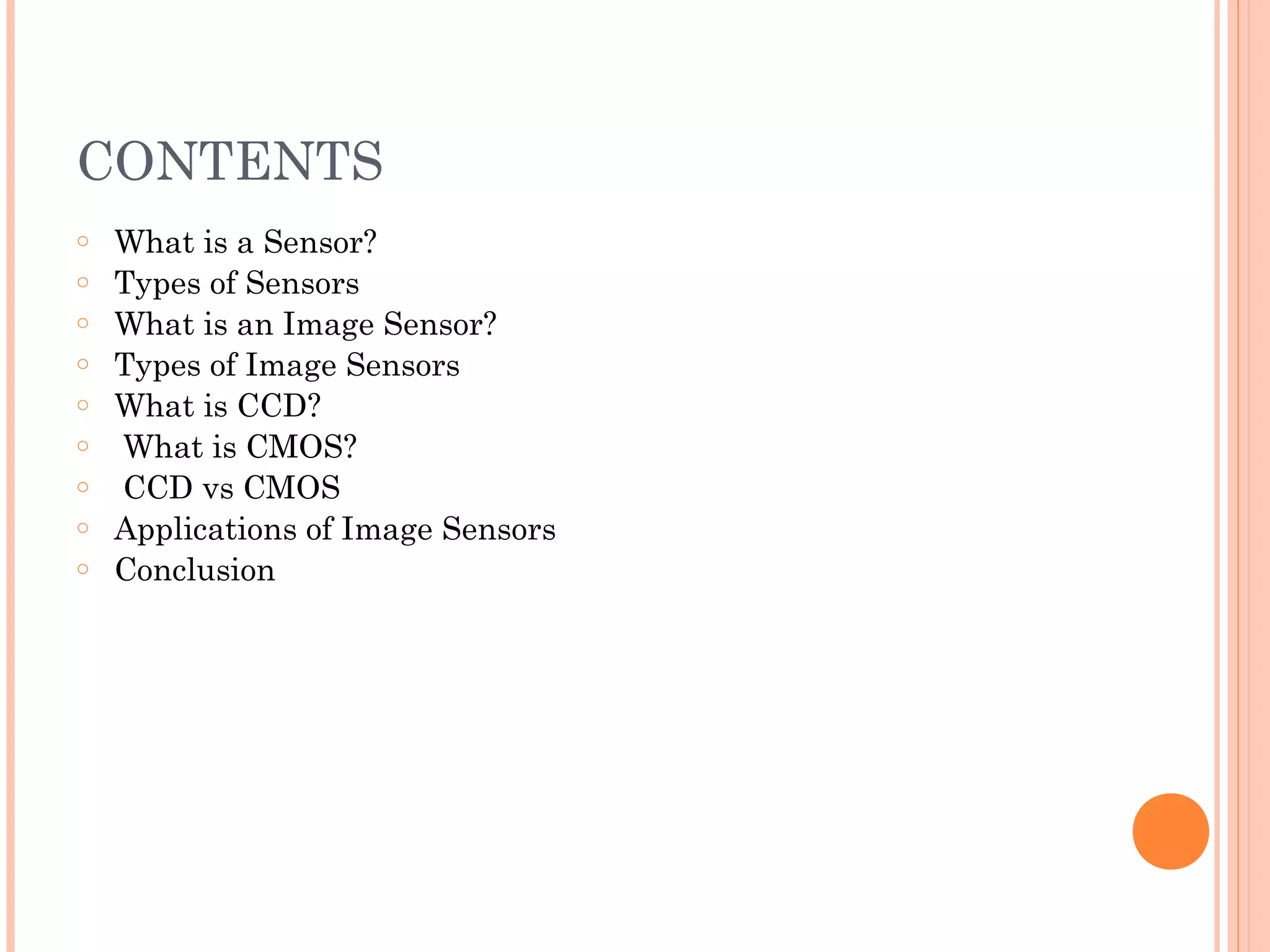 This document discusses image sensors, including what they are, their history, types (CCD and CMOS), and applications. An image sensor converts light into digital signals and contains millions of photosensitive diodes. The two main types are CCDs, which store and transfer electrons, and CMOS sensors, which can incorporate additional circuits. While CCDs generally have better image quality in low light, CMOS sensors are smaller, cheaper, and more power efficient. Image sensors are now widely used in applications like digital cameras, camcorders, PDAs, fingerprint scanners, and more.