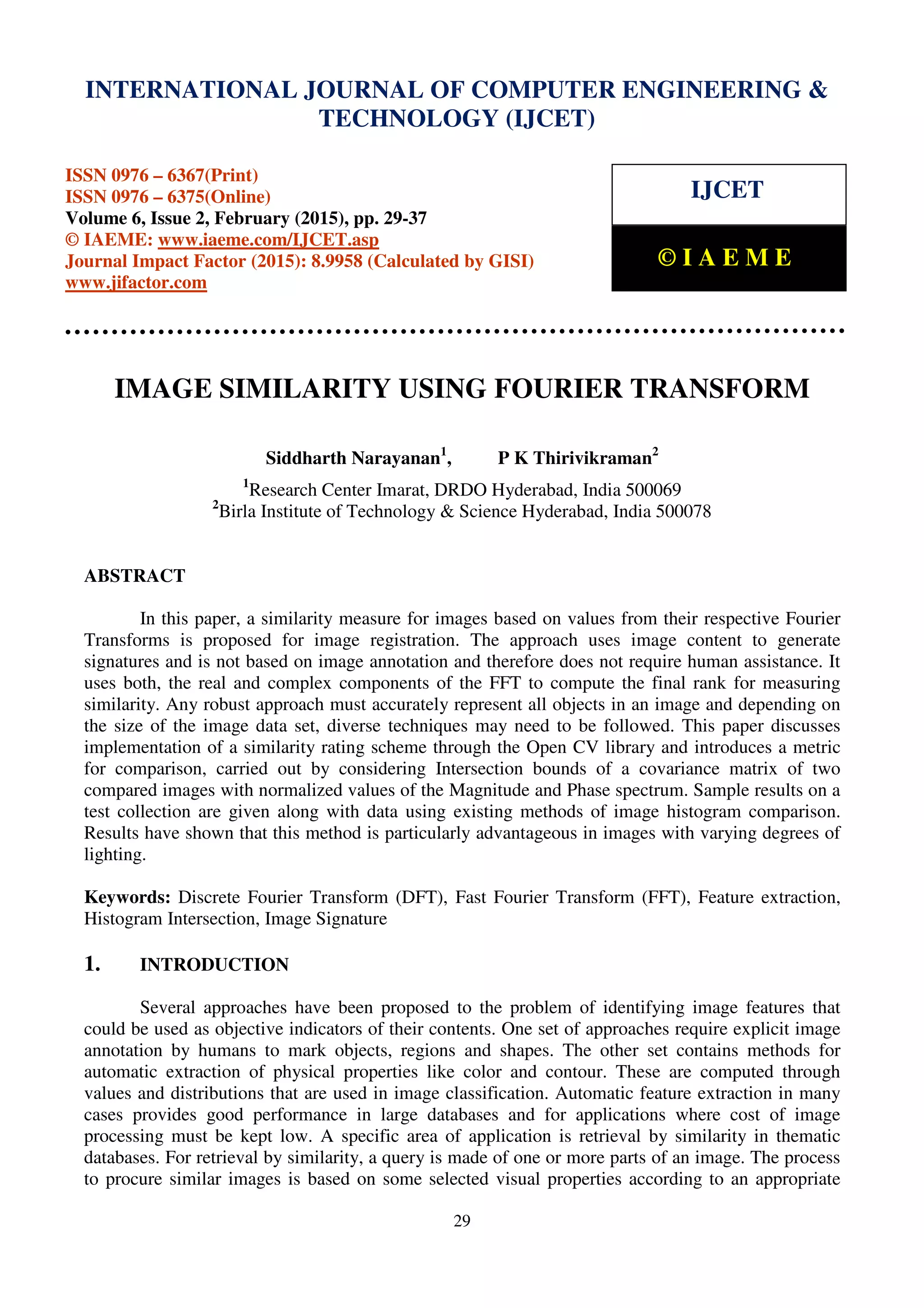 This document discusses using Fourier transforms to measure image similarity. It proposes a metric that uses both the real and complex components of the Fourier transform to compute a similarity ranking between two images. The metric calculates the intersection of the covariance matrix of the Fourier transform magnitude and phase spectra of the two images. The approach is shown to be advantageous for images with varying degrees of lighting. It summarizes existing methods for image comparison and feature extraction, and discusses implementing the proposed similarity metric using OpenCV. Sample results are given comparing the new Fourier-based method to existing histogram comparison techniques.