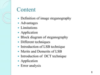 Image steganography is the art of hiding information within digital images. The document discusses various techniques for image steganography including LSB (least significant bit) and DCT (discrete cosine transform). LSB is a simple spatial domain technique that replaces the least significant bits of image pixels with bits of a secret message. DCT operates in the frequency domain by transforming image blocks and hiding data in the mid-frequency DCT coefficients. The document compares the advantages and disadvantages of these techniques, and discusses their applications for hiding private information or digital watermarking. Metrics for analyzing steganography systems like bit error rate, mean square error, and peak signal to noise ratio are also introduced.