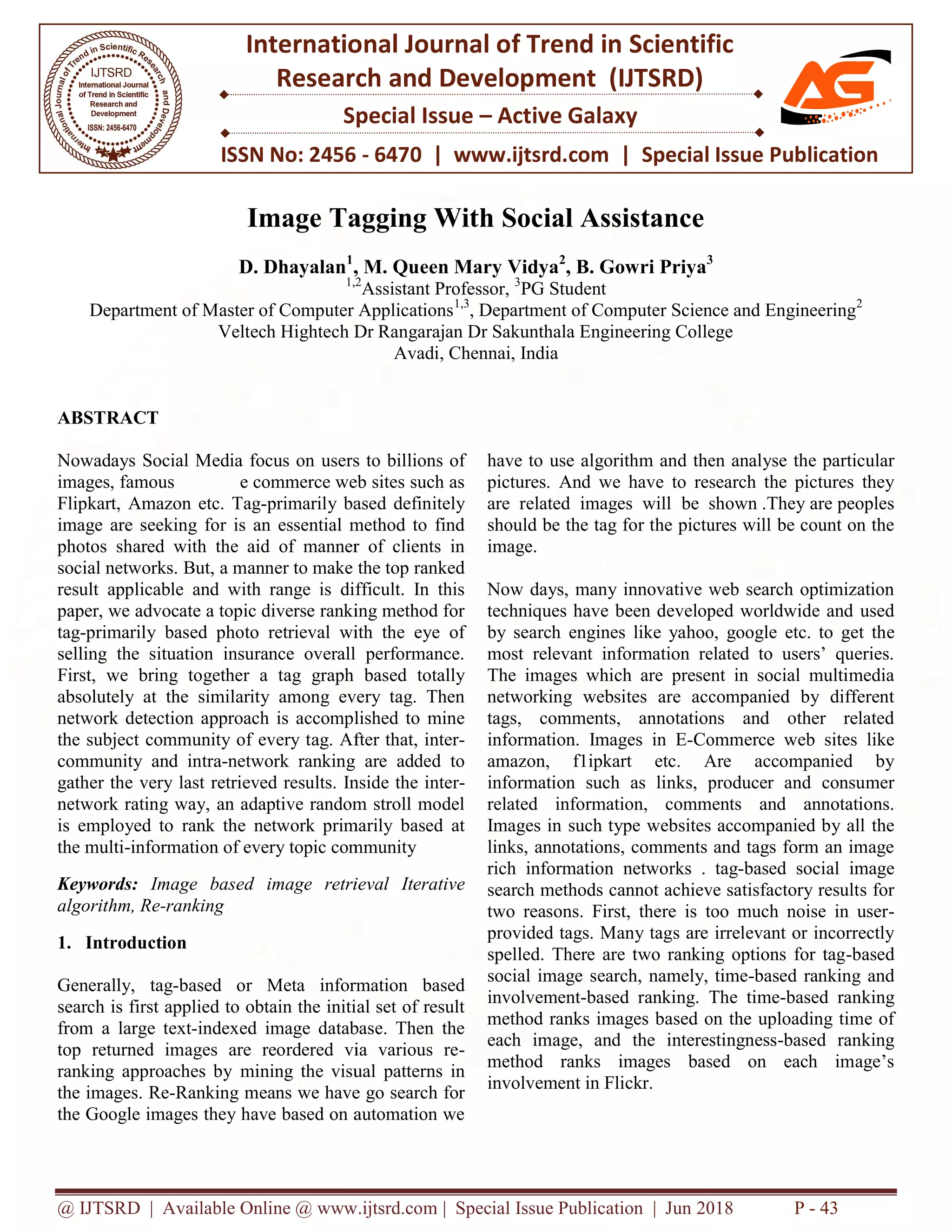 The document presents a method for tag-based image retrieval that utilizes topic diverse ranking to enhance the relevance and diversity of search results. It discusses the challenges of existing tag search methods, including noise from user-generated tags, and proposes a ranking system that incorporates both visual and textual information. The research confirms that using a tag graph and network detection can significantly improve the quality of retrieved images on social media and e-commerce platforms.