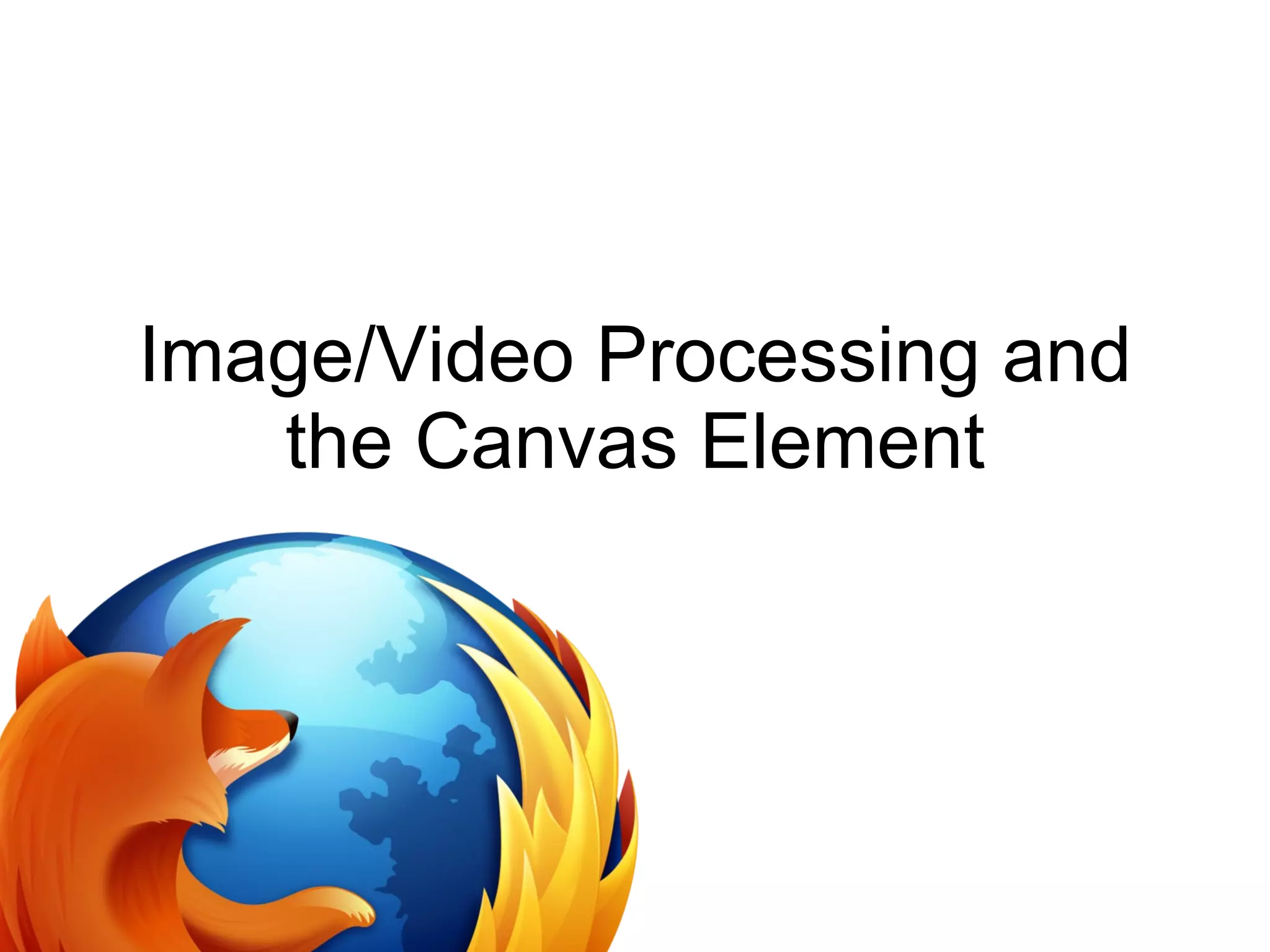 The document discusses HTML5 features, focusing on the canvas element for image and video processing, and its potential for real-time applications. It highlights the advantages of using JavaScript, particularly with libraries for graphics and data visualization, over traditional compiled code. The intended learning outcomes include image processing techniques and collaborative development practices.